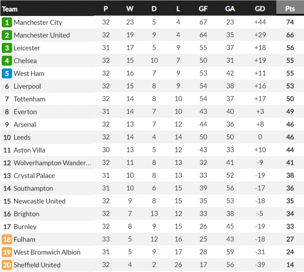 Hòa không bàn thắng với Brighton, song kết quả này vẫn đủ giúp Chelsea trở lại vị trí top 4 Premier League. The Blues có cùng 55 điểm sau 32 vòng đấu như West Ham nhưng hơn chỉ số phụ./.