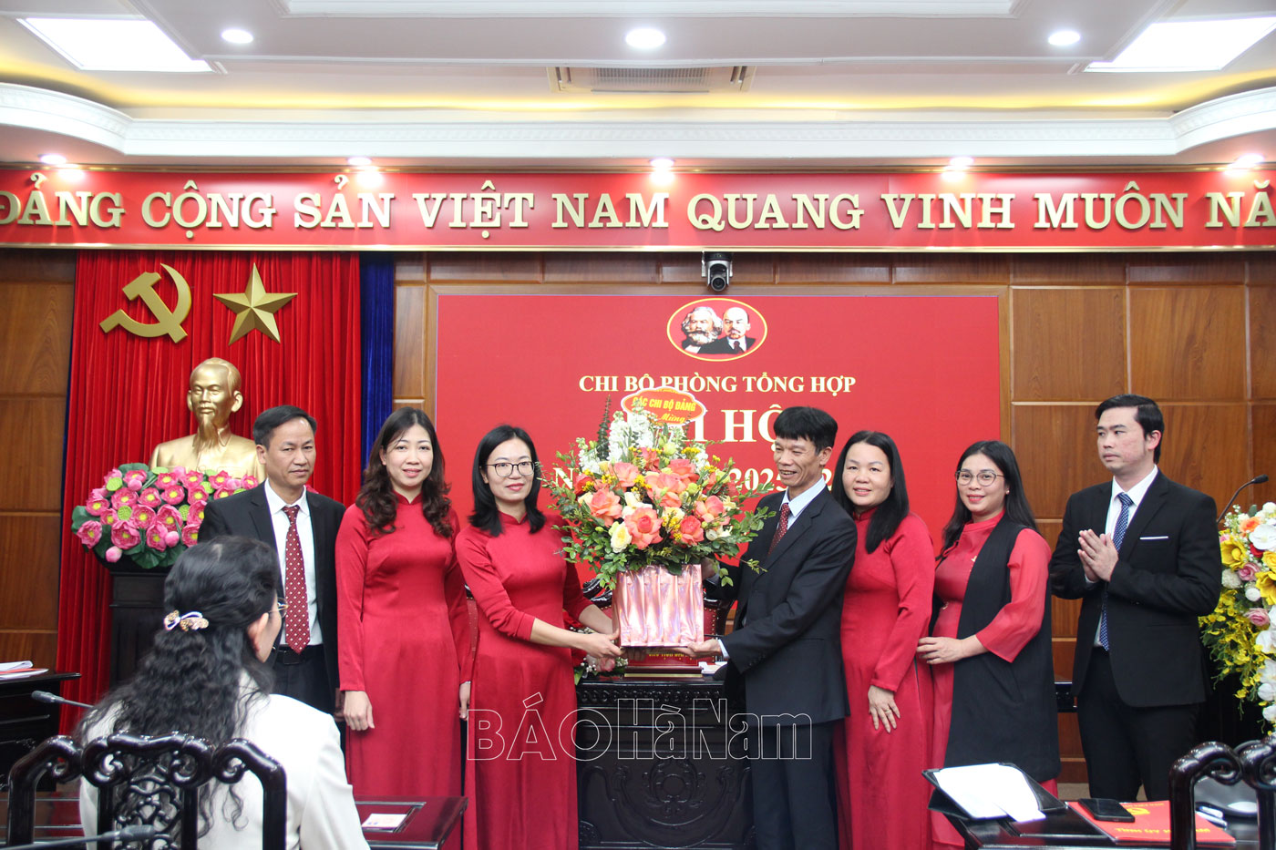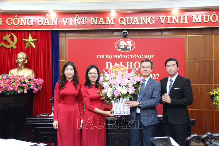 Đại diện các chi bộ trực thuộc Đảng bộ Văn phòng Tỉnh ủy tặng hoa chúc mừng Chi bộ Phòng Tổng hợp nhiệm kỳ 2025-2027.