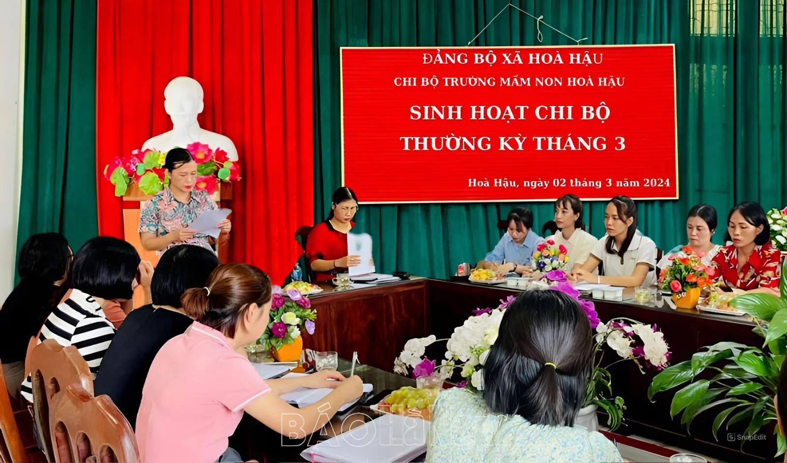 Từ thực tế thực hiện công tác phát triển đảng viên mới ở Chi bộ trường Mầm non Hoà Hậu cho thấy, chi bộ đã xác định và tập trung làm tốt việc học tập và làm theo tư tưởng, đạo đức, phong cách Hồ Chí Minh gắn với thực hiện nghiêm các quy định về đạo đức nhà giáo, phù hợp với chức trách, nhiệm vụ được giao… giúp đảng viên hoàn thành tốt và hoàn thành xuất sắc nhiệm vụ được giao; phấn đấu là những đảng viên 4 tốt, góp phần xây dựng chi bộ 4 tốt. Trong nhiệm kỳ 2023 - 2025, đến thời điểm tháng 6 năm 2024, chi bộ đã kết nạp được 6 đảng viên mới (năm 2023 kết nạp được 2 đảng viên, năm 2024 kết nạp được 4 đảng viên). Hiện tại, chi bộ đang tiếp tục đề nghị Đảng uỷ xã nhất trí cho làm hồ sơ kết nạp thêm 2 quần chúng đã hoàn thành lớp bồi dưỡng kiến thức về Đảng; có 4 quần chúng đã được chọn cử tham gia lớp bồi dưỡng nhận thức về Đảng vào quý IV/2024; hoàn thiện hồ sơ đề nghị chuyển đảng chính thức cho 2 đồng chí.