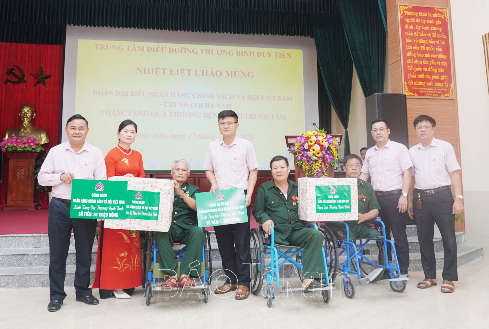 Kỷ niệm 76 năm Ngày Thương binh - Liệt sĩ (27/7/1947-27/7/2023), ngày 17 và 18/7, Công đoàn Ngân hàng Chính sách Xã hội (NHCSXH) Việt Nam và Công đoàn cơ sở Chi nhánh NHCSXH tỉnh Hà Nam đã tổ chức thăm, tặng quà Trung tâm nuôi dưỡng thương bệnh binh (TBB) nặng và điều dưỡng người có công tỉnh Hà Nam, Trung tâm Điều dưỡng thương binh Kim Bảng, Trung tâm Điều dưỡng thương binh Duy Tiên.