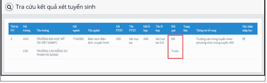 Mỗi trường mà thí sinh đăng ký xét tuyển chỉ có 1 kết quả là đỗ hoặc trượt. Nếu kết quả là trượt có nghĩa là thí sinh trượt tất cả các nguyện vọng đã đăng ký vào trường.