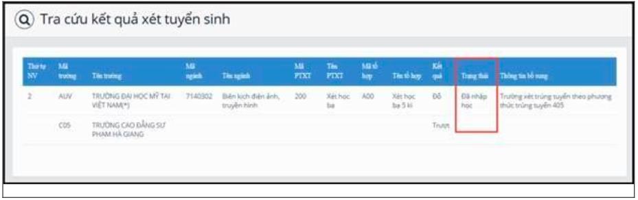 Trạng thái thông tin của thí sinh “Đã nhập học” nghĩa là thí sinh đã xác nhận nhập học thành công và trường đại học đã nhận được thông tin xác nhận nhập học của thí sinh. Khi đã xác nhận nhập học xong, thí sinh sẽ không được hủy xác nhận nhập học, nếu muốn hủy xác nhận nhập học phải liên hệ với trường đại học đó để được giải quyết.