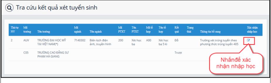 Đối với nguyện vọng đỗ thí sinh có quyền xác nhận nhập học. Để xác nhận nhập học thí sinh nhấn nút xác nhận nhập học như hình dưới.