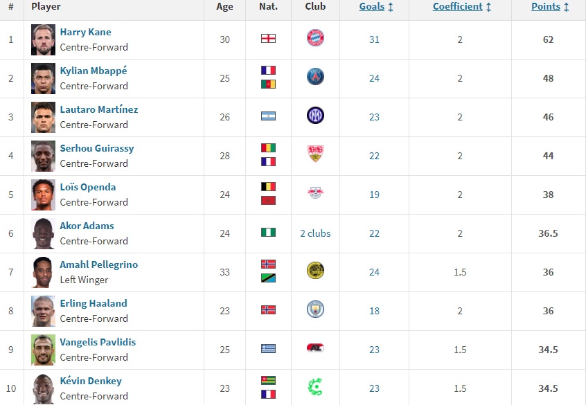 Cụ thể, Mbappe đã vươn lên vị trí thứ 2 với 48 điểm, kém Kane 14 điểm. Chân sút sinh năm 1998 hoàn toàn có thể vượt mặt người đàn anh khi Ligue 1 vẫn còn 12 vòng đấu trong khi Bundesliga chỉ còn 8 vòng là kết thúc mùa giải.
