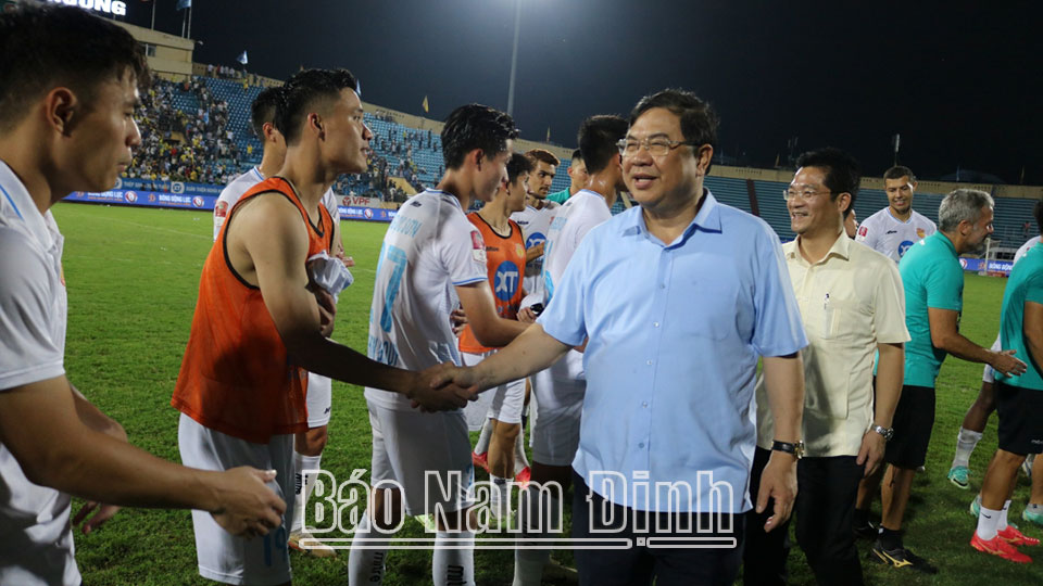 | Đồng chí Bí thư Tỉnh ủy Phạm Gia Túc chúc mừng các cầu thủ Thép Xanh Nam Định. |