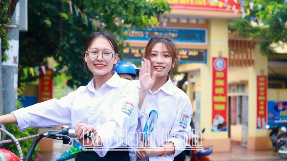 | Niềm vui của các thí sinh sau khi hoàn thành bài thi tổ hợp Khoa học tự nhiên tại Điểm thi THPT Giao Thủy B (Giao Thủy). |