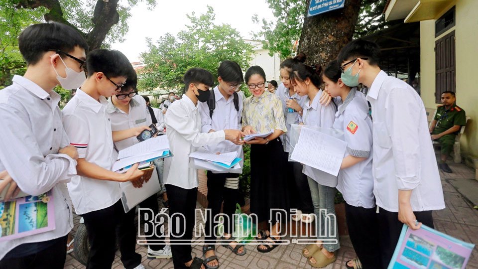 | Thí sinh tại Điểm thi THPT chuyên Lê Hồng Phong (thành phố Nam Định) trao đổi đáp án sau khi làm xong bài thi tổ hợp. |