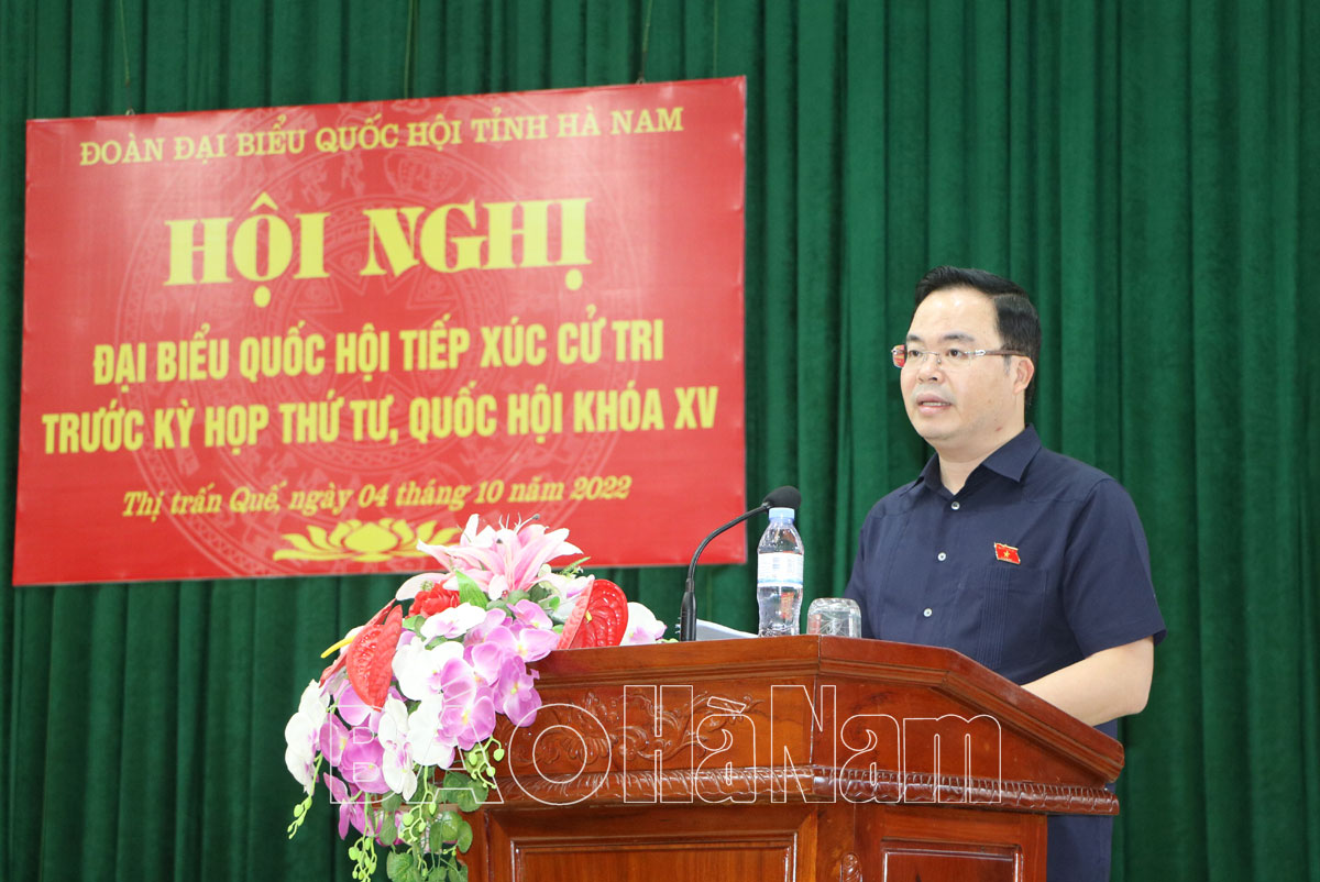 Tiếp tục chương trình tiếp xúc cử tri trước kỳ họp thứ 4, Quốc hội khóa XV, nhiệm kỳ 2021 - 2026, chiều 4/10, Đoàn đại biểu Quốc hội (ĐBQH) tỉnh gồm các đồng chí: Phạm Hùng Thắng, Tỉnh ủy viên, Phó Trưởng đoàn đại biểu Quốc hội tỉnh; Trần Văn Khải, Ủy viên Thường trực Ủy ban Khoa học, Công nghệ và Môi trường của Quốc hội đã có buổi tiếp xúc với cử tri thị trấn Quế (Kim Bảng). Cùng dự có đại diện các sở, ban, ngành của tỉnh; đại diện cấp ủy, chính quyền địa phương.