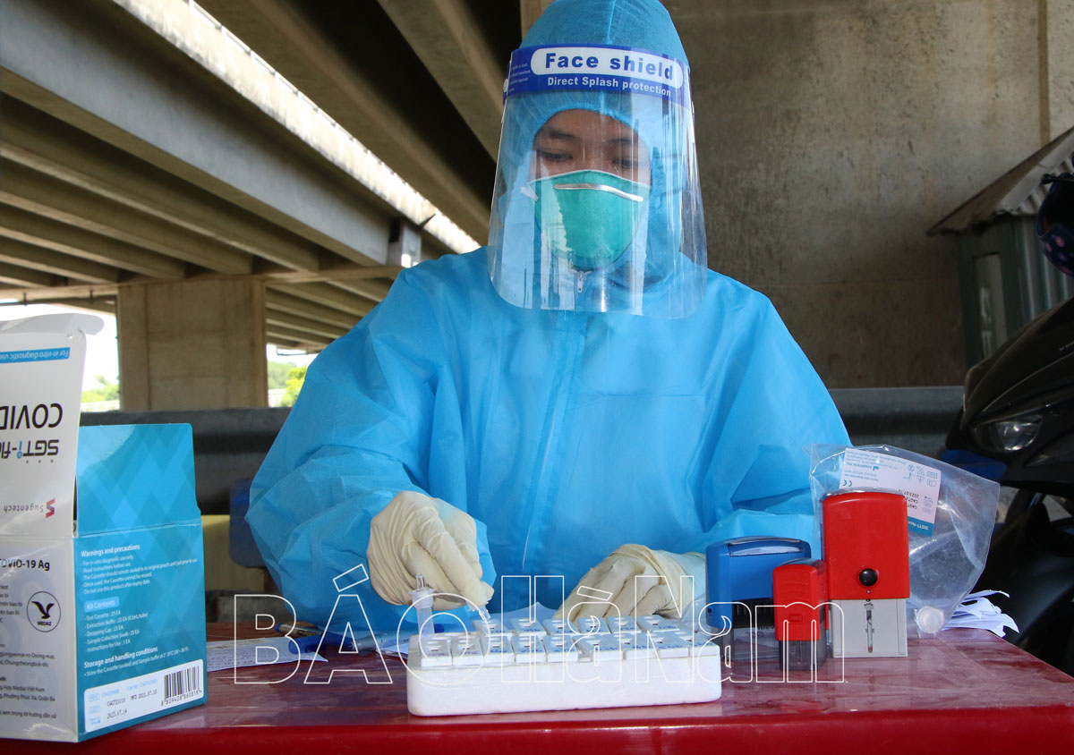 Lấy mẫu test nhanh Covid-19 tại nút giao Liêm Tuyền, thành phố Phủ Lý.