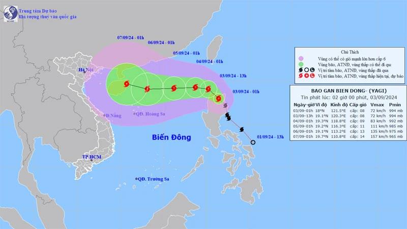 Dự báo khoảng chiều và đêm 3/9 bão Yagi đi vào Biển Đông. Từ trưa và chiều 3/9 vùng biển phía đông bắc của khu vực bắc Biển Đông gió mạnh dần lên cấp 6, vùng gần tâm bão mạnh cấp 8, giật trên cấp 11; biển động mạnh.