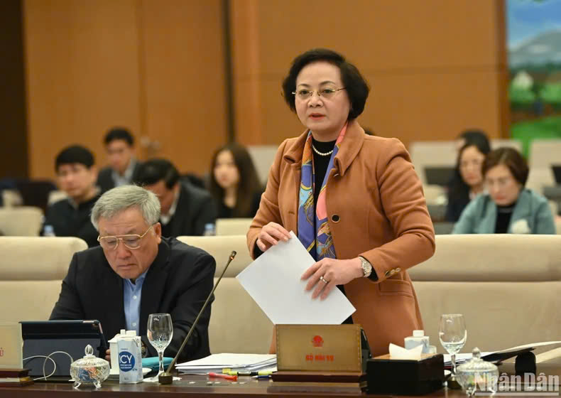 Bộ trưởng Nội vụ Phạm Thị Thanh Trà trình bày tờ trình của Chính phủ tại phiên họp. (Ảnh: DUY LINH)