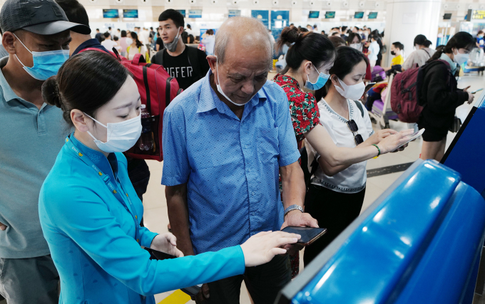 Hành khách được nhân viên hàng không hướng dẫn tại sân bay Nội Bài.