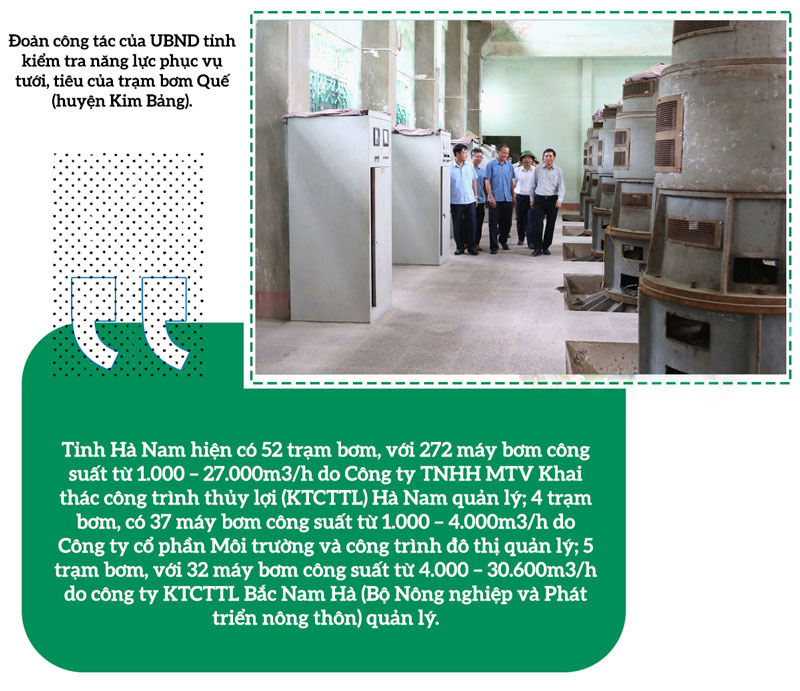 Theo ông Trương Đức Thiện, Trưởng phòng quản lý nước và công trình, Công ty TNHH MTV Khai thác công trình thủy lợi Hà Nam, năng lực phục vụ của hệ thống thủy lợi hiện nay đã được nâng lên rất nhiều, nhất là các công trình đầu mối (trạm bơm). Với sản xuất nông nghiệp, đơn vị bảo đảm tiêu nước tốt khi lượng mưa khoảng 150 mm trong thời gian 3 ngày. Riêng các khu công nghiệp khi có mưa lớn xảy ra, đơn vị sẽ phục vụ mức cao nhất có thể, cố gắng hạn chế thấp nhất ảnh hưởng đến hoạt động sản xuất, kinh doanh trong các khu công nghiệp…