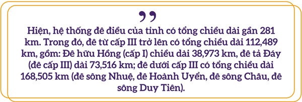 Hiện, hệ thống đê điều của tỉnh có tổng chiều dài gần 281 km. Trong đó, đê từ cấp III trở lên có tổng chiều dài 112,489 km, gồm: Đê hữu Hồng (cấp I) chiều dài 38,973 km, đê tả Đáy (đê cấp III) dài 73,516 km; đê dưới cấp III có tổng chiều dài 168,505 km (đê sông Nhuệ, đê Hoành Uyển, đê sông Châu, đê sông Duy Tiên). Do yêu cầu của công tác PCTT, những năm gần đây, hệ thống đê điều trên địa bàn tỉnh đã được đầu tư tu bổ, nâng cấp. Điển hình, chiều dài tuyến đê hữu Hồng cơ bản đã được đầu tư cứng hóa bằng bê tông, láng nhựa và asphalt nhựa, với bề rộng 5 – 6 m. Cùng với đó, các địa phương tăng cường xử lý, giải tỏa các vi phạm hành lang bảo vệ đê.