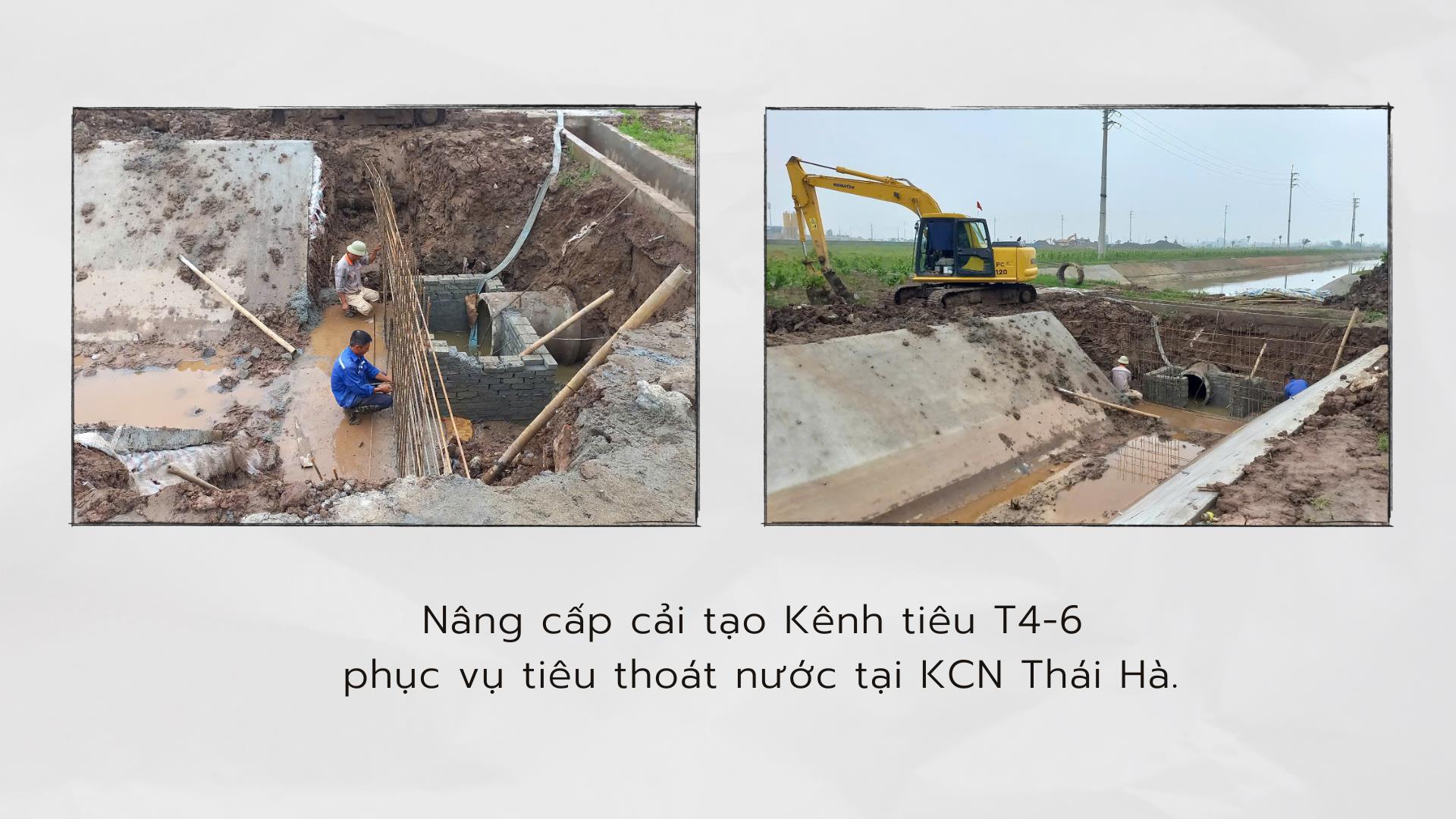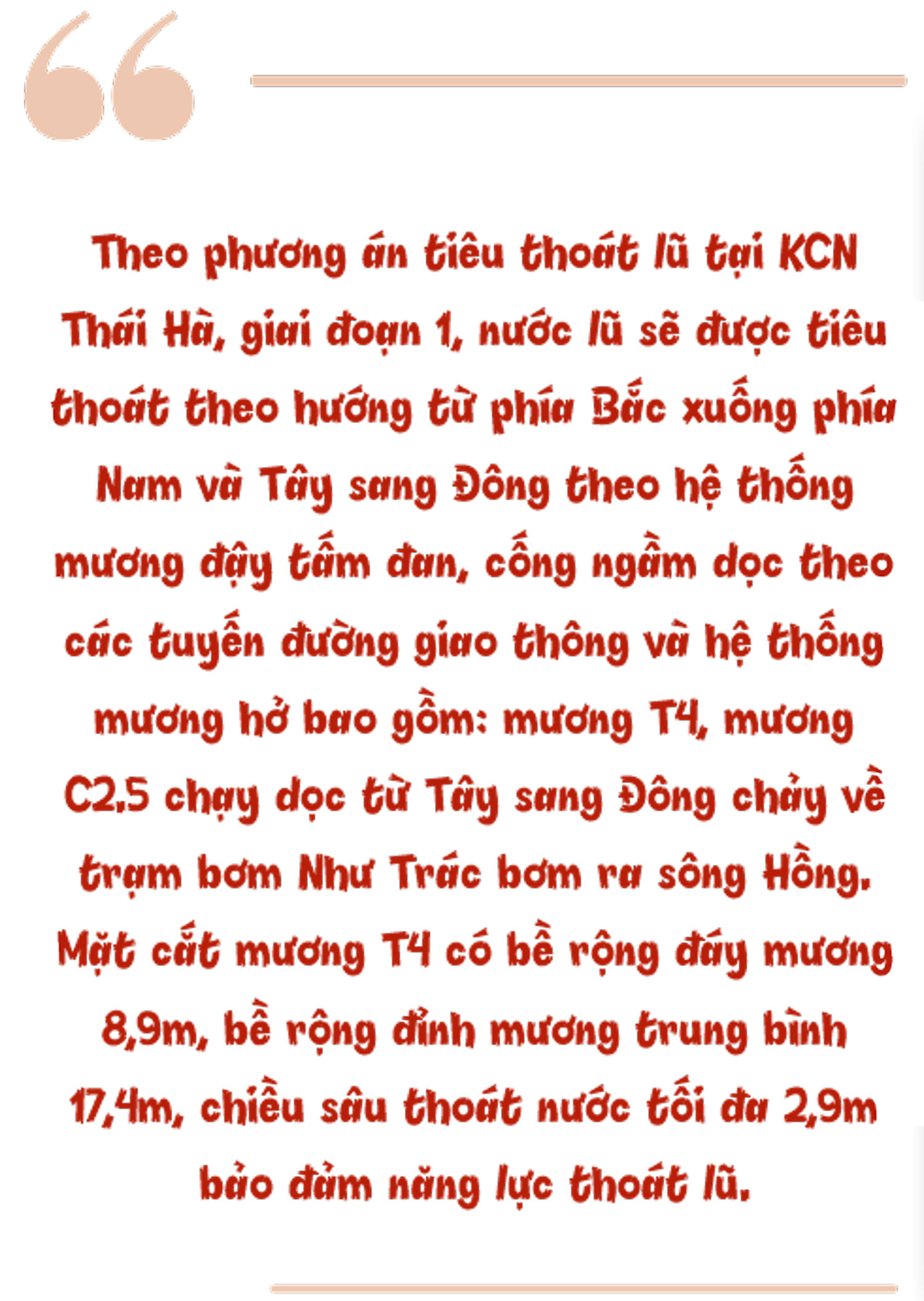 Trong phương án phòng, chống lụt bão, hạn chế thiên tai, công ty xây dựng phương án tiêu thoát nước mưa, lũ, bảo đảm tiêu thoát nước nhanh để không làm ảnh hưởng đến hoạt động sản xuất của các doanh nghiệp. Cụ thể, theo phương án tiêu thoát lũ tại KCN Thái Hà, giai đoạn 1, nước lũ sẽ được tiêu thoát theo hướng từ phía Bắc xuống phía Nam và Tây sang Đông theo hệ thống mương đậy tấm đan, cống ngầm dọc theo các tuyến đường giao thông và hệ thống mương hở bao gồm: mương T4, mương C2.5 chạy dọc từ Tây sang Đông chảy về trạm bơm Như Trác bơm ra Sông Hồng. Mặt cắt mương T4 có bề rộng đáy mương 8,9m, bề rộng đỉnh mương trung bình 17,4m, chiều sâu thoát nước tối đa 2,9m bảo đảm năng lực thoát lũ.
