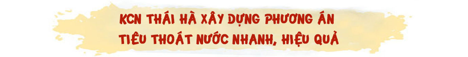Hiện tại KCN Thái Hà, giai đoạn 1 đã có nhà máy đi vào hoạt động chính thức; một số nhà máy đang trong quá trình xây dựng. Để chủ động trong công tác phòng, chống lụt bão, công ty phối hợp chặt chẽ cùng các nhà thầu đang thi công hạ tầng chuẩn bị máy móc, con người ứng trực sẵn sàng khơi thông dòng chảy, vớt bèo rác khi cần thiết; đồng thời phối hợp với các cơ quan, đơn vị liên quan trong việc thực hiện phòng, chống lụt bão và tìm kiếm cứu nạn, bảo đảm tiêu thoát lũ nhanh nhất nhằm bảo vệ an toàn con người, bảo vệ sản xuất kinh doanh của các doanh nghiệp.