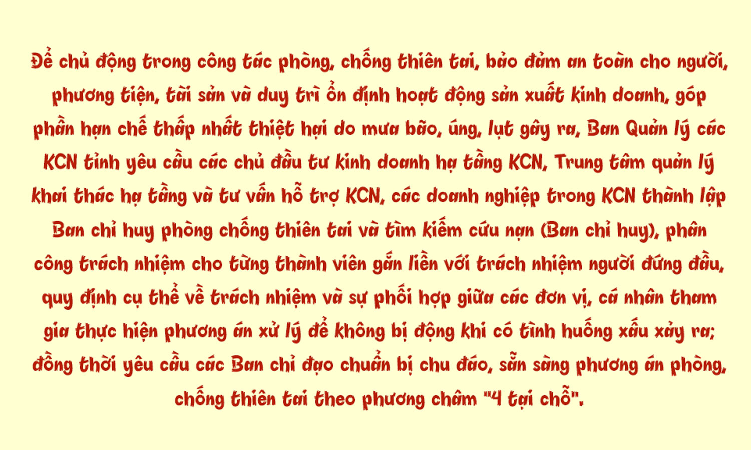 Chủ động phòng, chống thiên tai bảo vệ sản xuất kinh doanh, bảo đảm an toàn cho người và tài sản của doanh nghiệp trong các khu công nghiệp (KCN), hằng năm, Ban Quản lý các KCN tỉnh yêu cầu chủ đầu tư kinh doanh hạ tầng KCN, Trung tâm quản lý khai thác hạ tầng và tư vấn hỗ trợ KCN và các doanh nghiệp xây dựng phương án phòng, chống lụt, bão theo phương châm “4 tại chỗ”. Ban cũng đặc biệt lưu ý các đơn vị và doanh nghiệp luôn cảnh giác, không chủ quan, lơ là, thường xuyên theo dõi chặt chẽ diễn biến thời tiết để chủ động tổ chức phòng tránh, ứng phó và khắc phục hậu quả thiên tai kịp thời, hiệu quả.