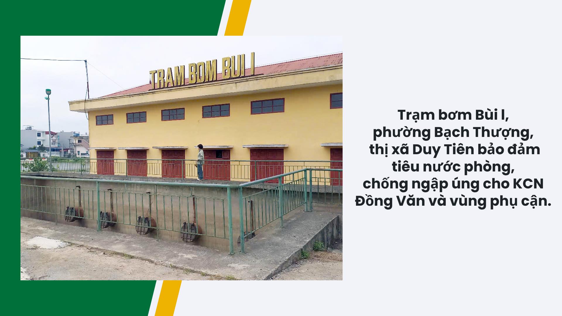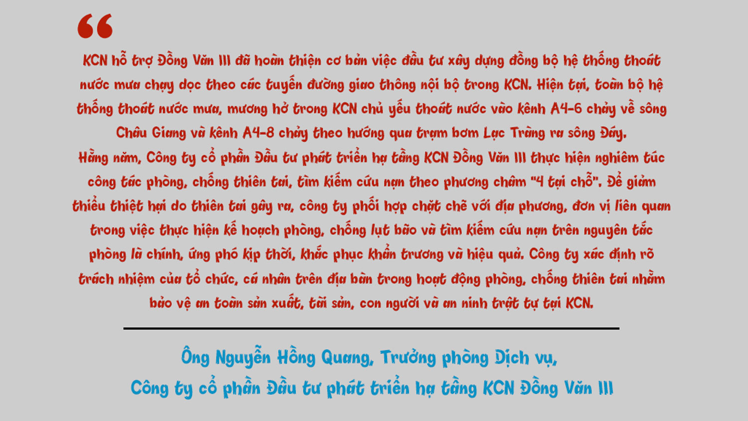 Tại KCN Đồng Văn I và Đồng Văn I mở rộng, Trung tâm quản lý, khai thác hạ tầng và tư vấn hỗ trợ KCN xây dựng phương án sẵn sàng phòng, chống lụt bão; trong đó bố trí lực lượng thường trực 24/24 giờ để nắm chắc diễn biến tình hình mưa lớn, thiên tai và triển khai các phương án ứng phó, trực tiếp xuống hiện trường để kiểm tra và chỉ đạo triển khai công tác ứng phó. Trong trường hợp mưa lớn kéo dài, Trung tâm sẽ phối hợp với đơn vị thủy nông vận hành các trạm bơm: Hoành Uyển, Bùi 1 và Bùi 2 bơm tiêu nước ra sông; tổ chỉ huy phòng, chống lụt, bão, hạn chế thiên tai kiểm tra cơ sở vật chất, thiết bị, sửa chữa khắc phục kịp thời, không để tình trạng không sử dụng được khi cần đến.
