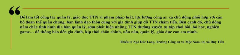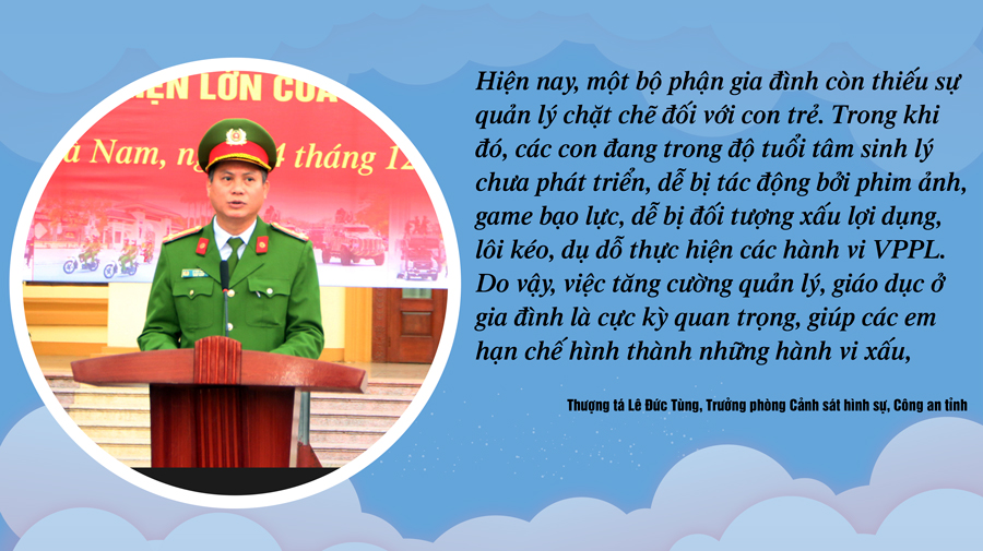 Với Hà Nam, theo số liệu từ Công an tỉnh giai đoạn 2021- 2023 trên địa bàn toàn tỉnh đã xảy ra 156 vụ/278 đối tượng VPPL do người dưới 18 tuổi thực hiện, tập trung ở các tội: cố ý gây thương tích, TCTS, cướp giật tài sản, gây rối TTCC, sử dụng trái phép chất ma túy, các hành vi liên quan đến ma túy... Cơ quan chức năng đã điều tra, làm rõ 94 vụ/156 đối tượng, xử lý hình sự 52 vụ, 84 đối tượng; xử lý hành chính 56 vụ, 67 đối tượng; giáo dục tại gia đình 62 đối tượng; giáo dục tại xã, phường, thị trấn 71 đối tượng; biện pháp khác (phạt tiền, cảnh cáo, nhắc nhở) 36 đối tượng. Địa điểm xảy ra hành vi phạm tội của đối tượng người chưa thành niên thường tập trung chủ yếu ở thành phố Phủ Lý, thị xã Duy Tiên, huyện Kim Bảng, là những địa phương có nhiều khu, cụm công nghiệp, hàng quán dịch vụ...