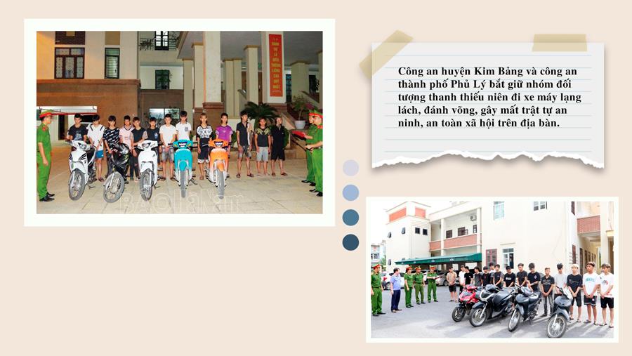 Điển hình: ngày 4/7/2023, Cơ quan Cảnh sát điều tra, Công an thành phố Phủ Lý đã ra quyết định khởi tố vụ án, khởi tố bị can đối với 15 đối tượng về hành vi “Gây rối TTCC” (xảy ra ngày 20/6/2023 tại Tổ 8, phường Lương Khánh Thiện, thành phố Phủ Lý). Do mâu thuẫn cá nhân, tối 20/6/2023, nhóm 15 đối tượng do Phạm Vũ Đức Đạt (sinh năm 2007, trú tại xã Bình Nghĩa, huyện Bình Lục) cầm đầu đã sử dụng 6 xe máy tmang theo hung khí (vỏ chai bia Hà Nội), không đội mũ bảo hiểm, đi với tốc độ cao, lạng lách, đánh võng, bấm còi để đi tìm nhóm thanh niên trên địa bàn thành phố Phủ Lý với mục đích đánh nhau.