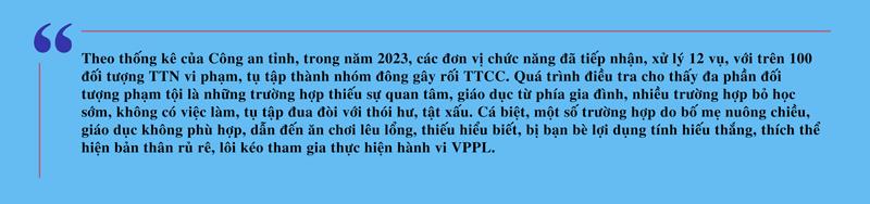 Ngoài ra, tác động từ mặt trái kinh tế thị trường, lối sống hưởng thụ, thực dụng đã, đang tồn tại ở một bộ phận TTN hiện nay cũng là một trong những nguyên nhân chính dẫn đến gia tăng hành vi tội phạm trong TTN. Điều đáng lo ngại hơn, thời gian gần đây, trên địa bàn tỉnh ta, tình hình tội phạm gây rối TTCC có chiều hướng diễn biến phức tạp, gây ảnh hưởng xấu đến trật tự an toàn xã hội, bức xúc trong quần chúng nhân dân. Các đối tượng phạm tội chủ yếu là nam giới, ở độ tuổi TTN, thực hiện hành vi phạm tội có tổ chức, tập trung theo hội nhóm, đông đối tượng tham gia, sử dụng phương tiện hỗ trợ (thường là xe máy không đeo biển kiểm soát) và mang theo hung khí nguy hiểm (dao, kiếm, mã tấu, phóng lợn, gạch, chai thủy tinh...). Các đối tượng thường tụ tập đuổi, đánh nhau, chửi bới, giải quyết mâu thuẫn cá nhân tại nơi công cộng hoặc điều khiển xe máy dàn hàng ngang, nẹt pô, bấm còi, di chuyển tốc độ cao, hò hét trên một số tuyến đường giao thông đường bộ khiến người dân hoang mang, lo sợ. Nhiều đối tượng mặc dù tuổi đời còn rất nhỏ nhưng đã có hành vi táo bạo, côn đồ, liều lĩnh dùng hung khí nguy hiểm gây thương tích hoặc hủy hoại tài sản của những người đi đường, người không liên quan đến mâu thuẫn cá nhân, thể hiện sự coi thường pháp luật.