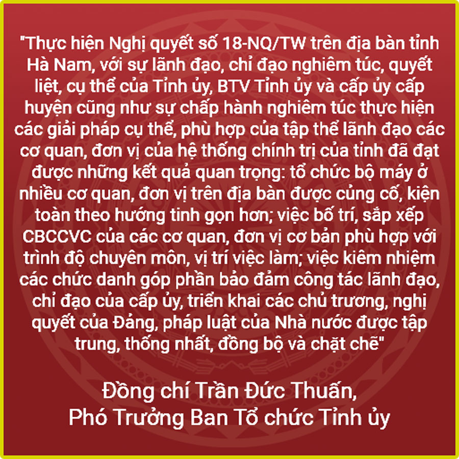 Theo báo cáo tổng kết thực hiện Nghị quyết số 18-NQ/TW ngày 25/10/2017 của BCH Trung ương Đảng khóa XII của Tỉnh ủy, nếu tính cả 2 giai đoạn (trong đó, giai đoạn 1 từ khi Trung ương ban hành Nghị quyết số 18-NQ/TW vào tháng 10/2017 đến tháng 10/2024 và giai đoạn 2 dự kiến sau thực hiện Đề án số 09), về tinh gọn bộ máy: giảm 4 cơ quan trực thuộc Tỉnh ủy (đạt 36,4%); giảm 5 sở (đạt 26,3%); giảm 83/383 đầu mối phòng, ban và tương đương cấp tỉnh, cấp huyện (đạt 21,7%) và 3 BCĐ; đồng thời, giảm 40 đơn vị sự nghiệp công lập cấp tỉnh, cấp huyện (đạt 8,2%), 18 đơn vị hành chính cấp xã (đạt 15,5%) và 553 thôn, tổ dân phố (đạt 44,6%). Về tinh giản biên chế: công chức đạt tỷ lệ 14,4% (215/1.503 người), viên chức tỷ lệ là 5,7% (881/15.327 người, do trong năm học 2022-2023 và năm học 2023-2024, Hà Nam được Trung ương bổ sung 972 biên chế giáo dục); cán bộ, công chức cấp xã đạt 11,3% và người hoạt động không chuyên trách ở cấp xã, thôn, tổ dân phố đạt 49,3%.