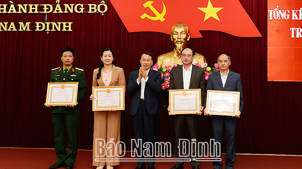 | Đồng chí Trưởng Ban Tổ chức Tỉnh ủy Nguyễn Văn Va trao Giấy khen của Ban Tổ chức Tỉnh ủy cho các tập thể. |