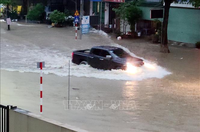 Các phương tiện di chuyển khó khăn khi mưa lớn gây ngập úng các tuyến đường. Ảnh: Trần Trang/TTXVN