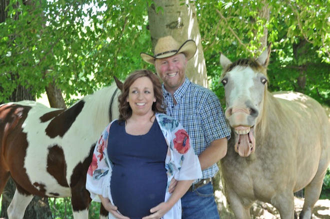 Cặp vợ chồng muốn đàn vật nuôi nhà mình cũng có mặt trong những bức ảnh đáng nhớ nên đã gọi chúng tới để cùng chụp hình. Trong số 3 con ngựa xuất hiện, con ngựa tên Buckshot, 12 tuổi có tính cách đặc biệt đã làm bầu không khí trở nên hài hước hơn bao giờ hết.