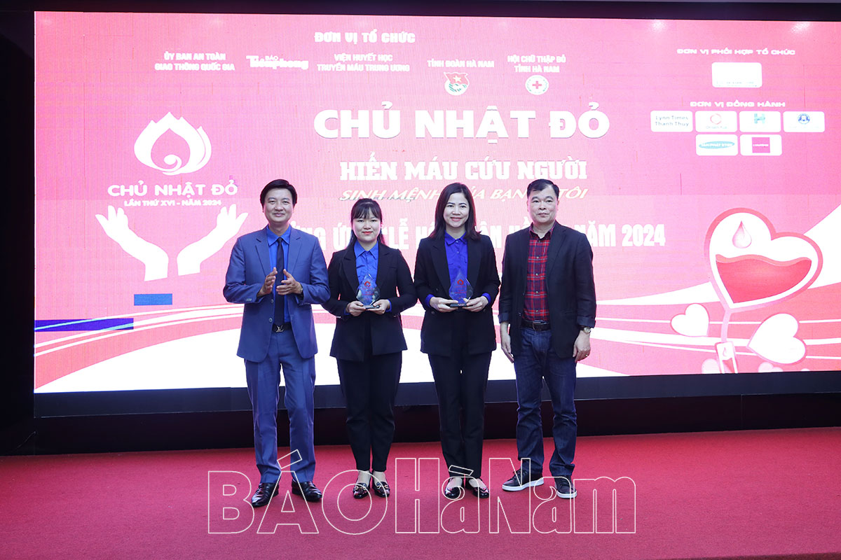 Lãnh đạo Tỉnh đoàn và đại diện Báo Tiền phong tặng kỷ niệm chương cho Thành đoàn Phủ Lý và Đoàn Khối các cơ quan tỉnh vì có nhiều đóng góp trong công tác vận động hiến máu tình nguyện.