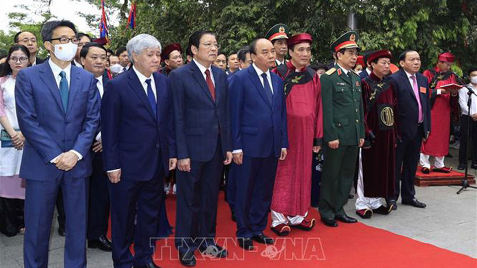 | Chủ tịch nước Nguyễn Xuân Phúc cùng Lãnh đạo Đảng, Nhà nước dự lễ dâng hương tại đền Thượng trong Khu Di tích lịch sử Quốc gia đặc biệt Đền Hùng (tỉnh Phú Thọ). |
