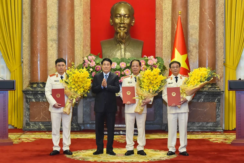 | Chủ tịch nước Lương Cường trao quyết định cho các đồng chí được bổ nhiệm. |