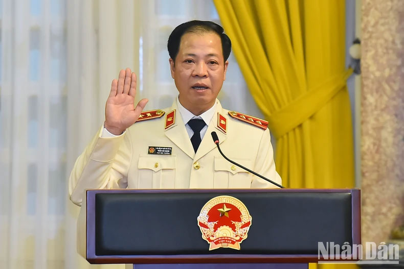 | Phó Viện trưởng Viện Kiểm sát nhân dân tối cao Trần Hải Quân thay mặt các đồng chí được bổ nhiệm tuyên thệ nhậm chức. |