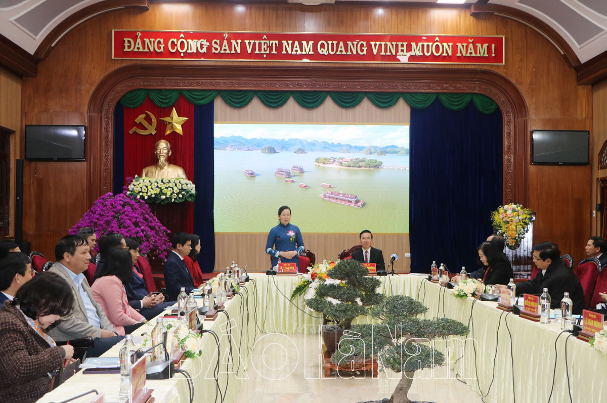 Tại buổi làm việc, thay mặt lãnh đạo tỉnh Hà Nam, đồng chí Lê Thị Thủy, Ủy viên Trung ương Đảng, Bí thư Tỉnh ủy, Chủ tịch HĐND tỉnh đã báo cáo kết quả phát triển kinh tế - xã hội năm 2023 và nhiệm vụ trọng tâm năm 2024 của tỉnh; tình hình tổ chức Tết Nguyên đán Giáp Thìn trên địa bàn tỉnh với Chủ tịch nước và đoàn công tác.