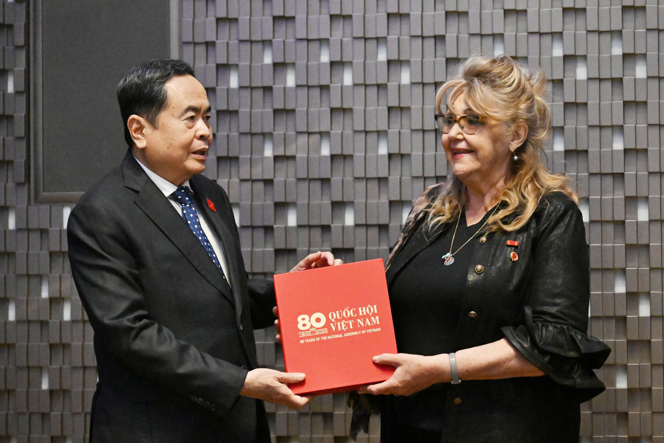 Tại cuộc tiếp, Chủ tịch Quốc hội Trần Thanh Mẫn đã trao tặng Lãnh sự danh dự Sandra Scagliotti cuốn sách về 80 năm Quốc hội Việt Nam. Lãnh sự danh dự Sandra Scagliotti đã trao tặng Chủ tịch Quốc hội Trần Thanh Mẫn cuốn sách về Chủ tịch Hồ Chí Minh.
