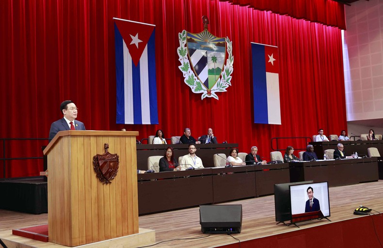 | Chủ tịch Quốc hội Vương Đình Huệ phát biểu tại phiên họp đặc biệt của Quốc hội Cuba. |