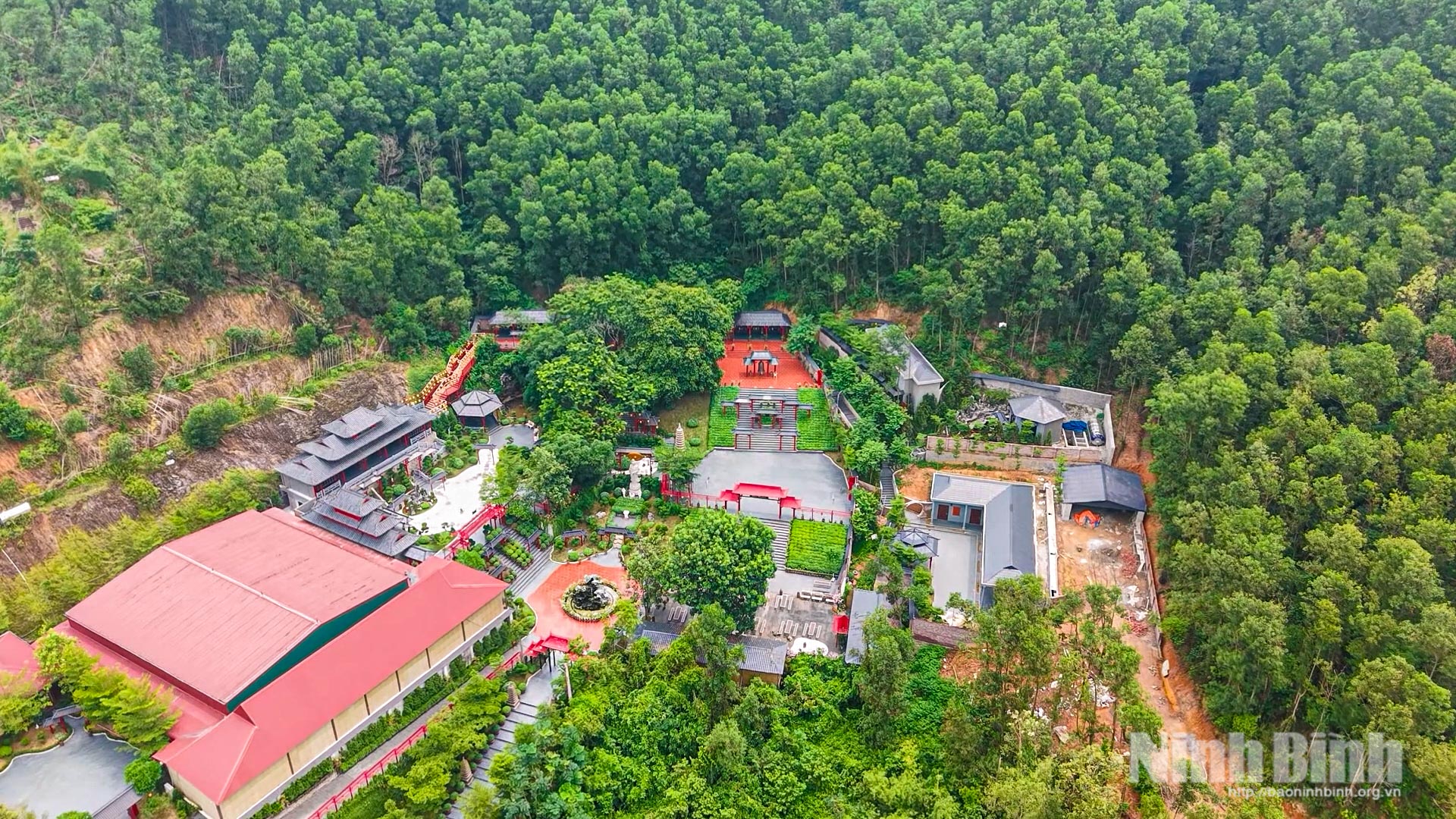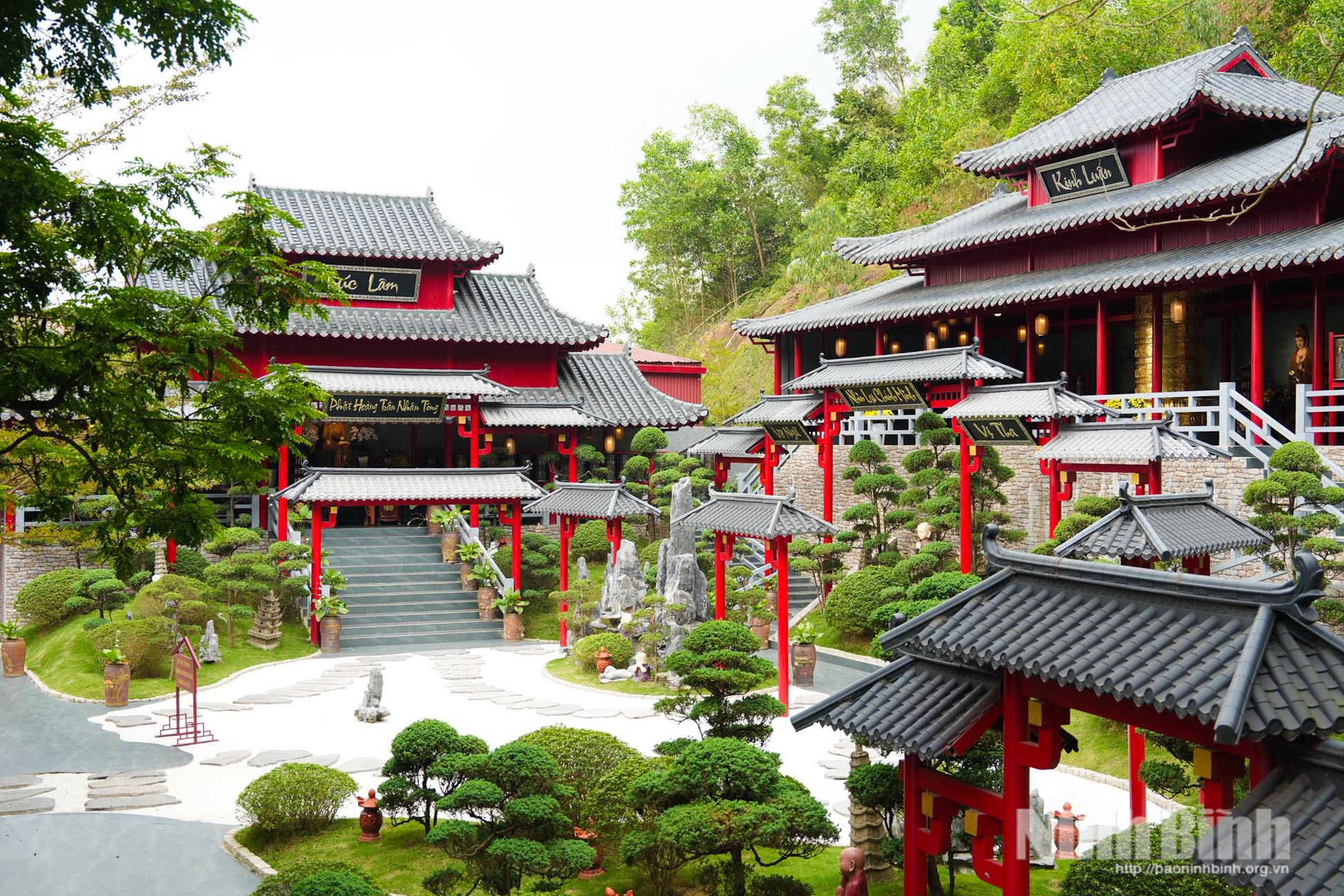 Toàn cảnh chùa Cây Thị nhìn từ trên cao, ẩn mình giữa rừng cây xanh mát.Lối vào chùa được bài trí theo phong cách vườn thiền, tạo cảm giác an yên.