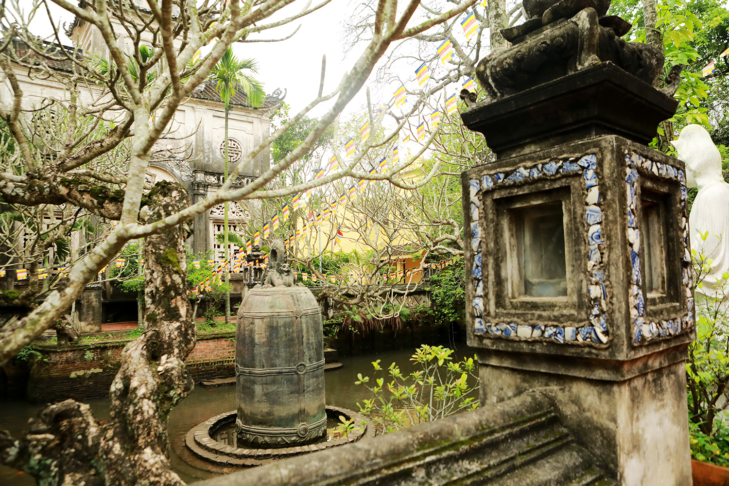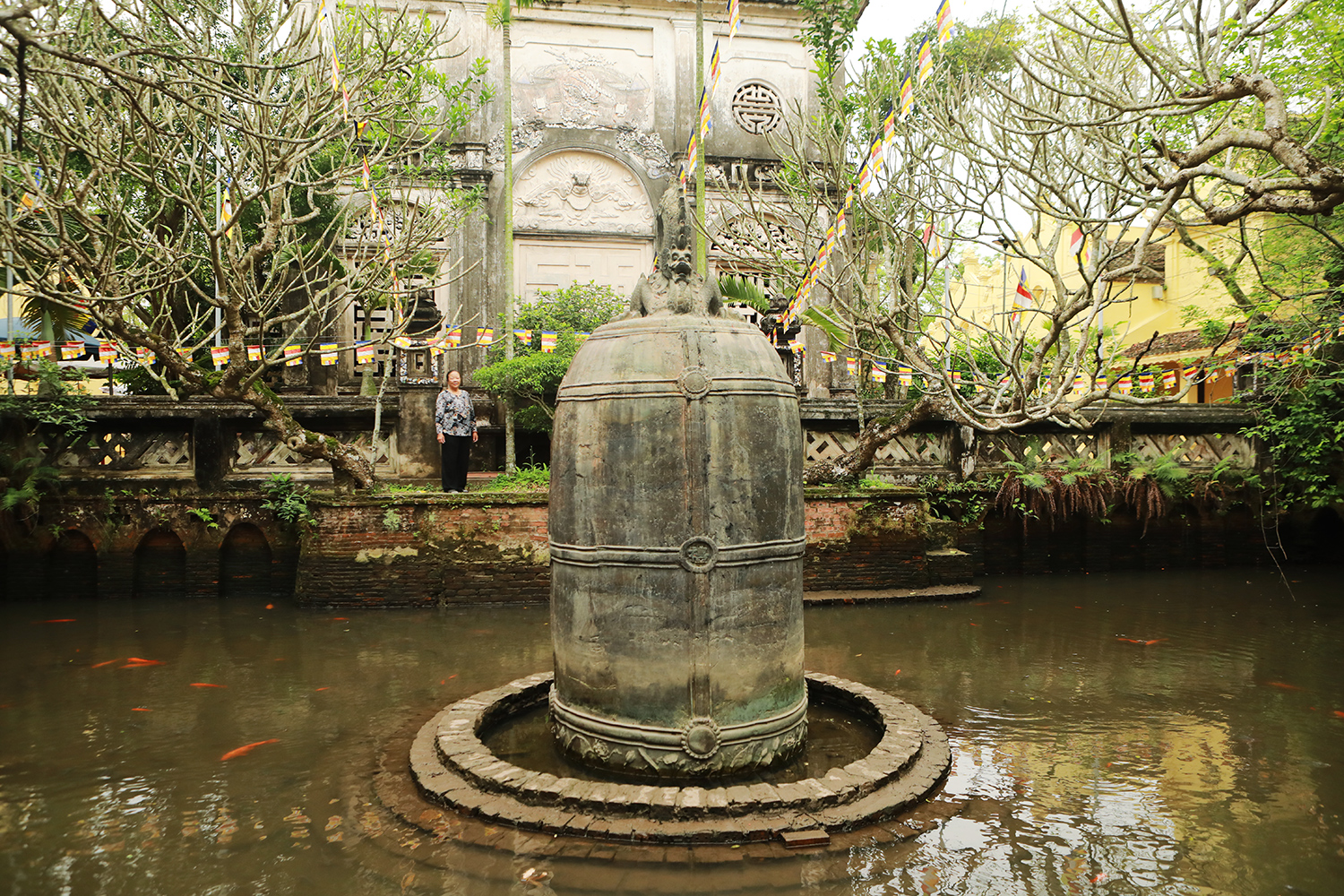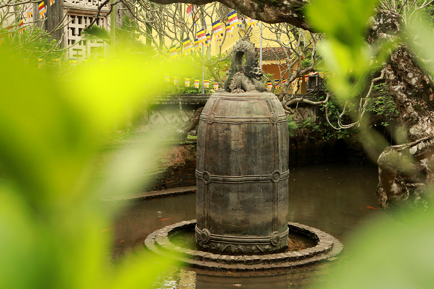 Chùa Cổ Lễ ngoài kiến trúc mái vòm độc đáo, kiên cố… nơi đây còn lưu giữ 1 quả chuông nặng 9 tấn, nằm giữa hồ trước chính điện.