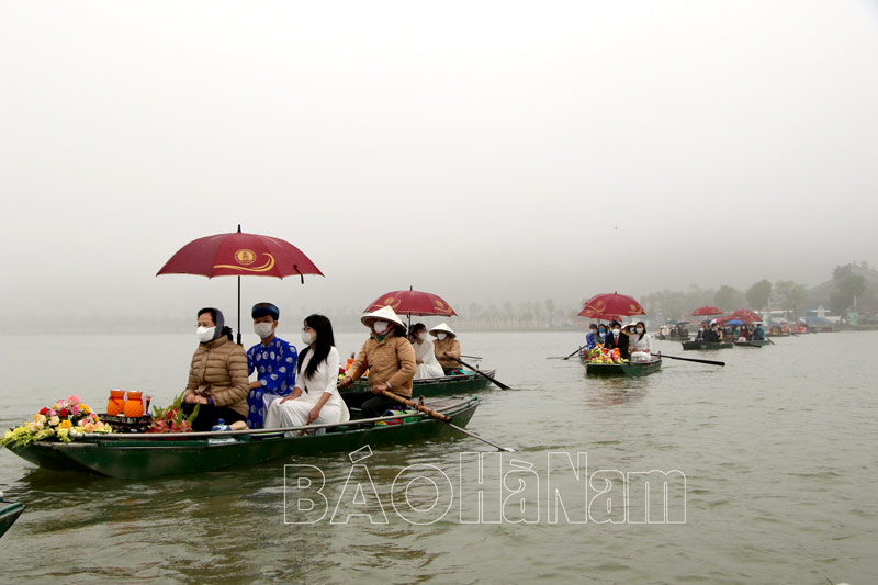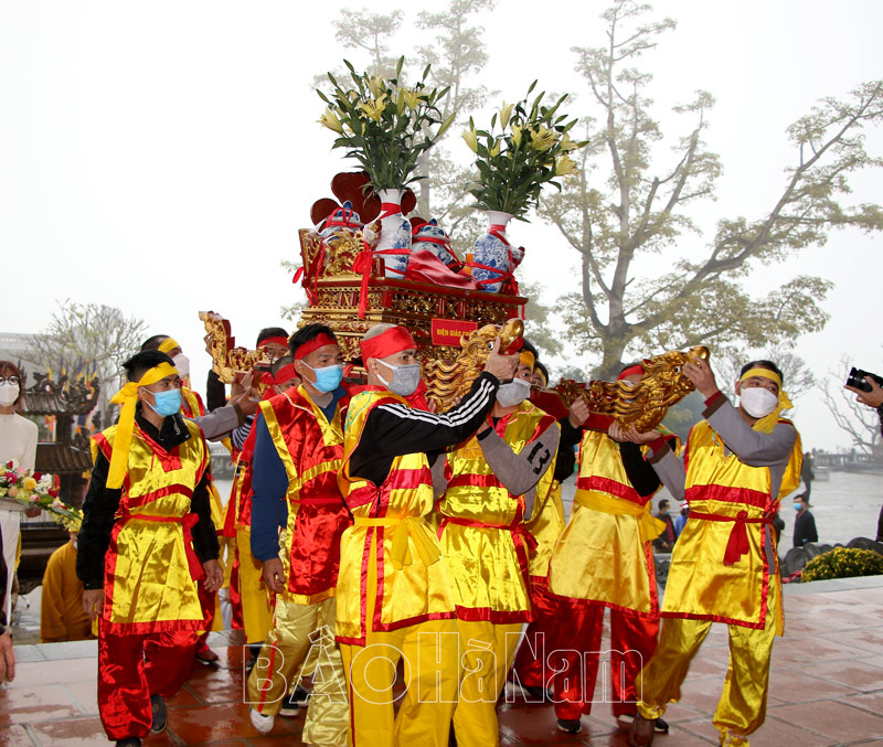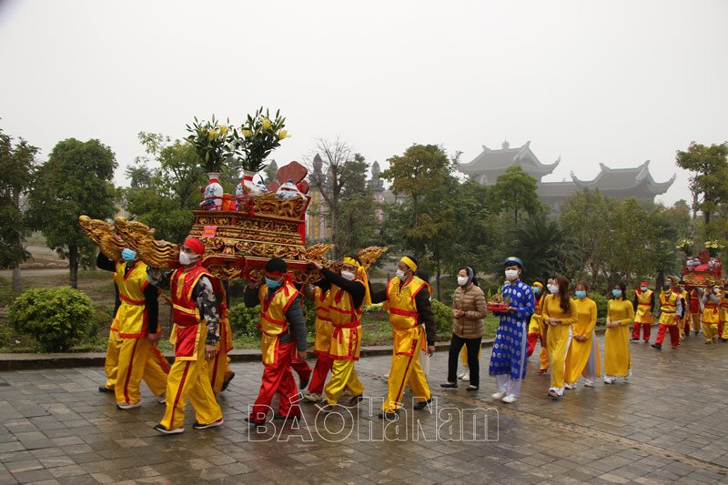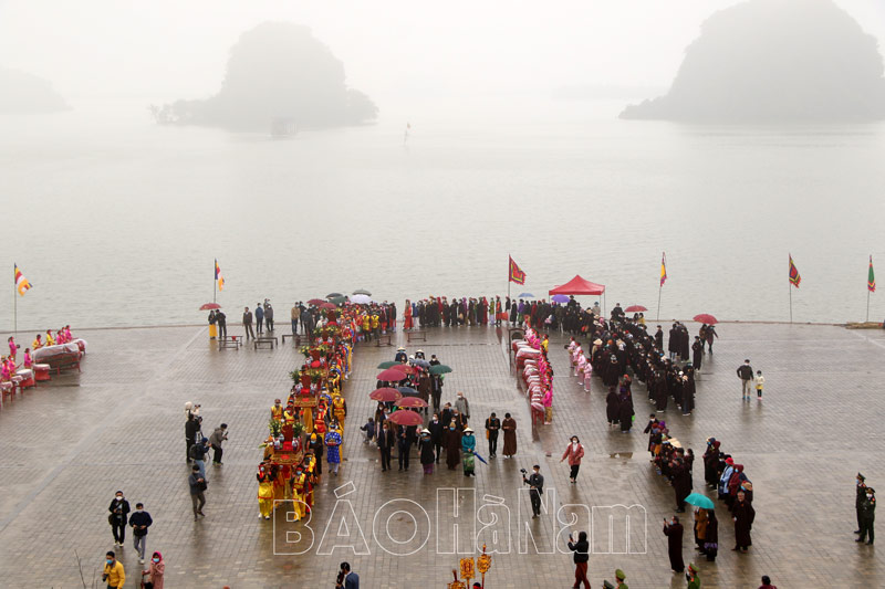 Thực hiện nghi thức lấy nước về chùaCác đội Rồng, lân, sư ra hồ Tam Chúc thực hiện nghi thức rước nướcSau khi ra đến vị trí linh thiêng của hồ, nơi đã cắm sẵn cây nêu, đoàn đi vòng quanh cây nêu 3 vòng rồi thực hiện múc nước vào bình để mang về bờĐoàn rước nước đã vào bờ, chuẩn bị rước kiệu lên các điện và chùa NgọcKiệu rước nước đi từ Tam quan nội, đến điện Quan âm, điện Pháp chủ, điện Tam thế và chùa NgọcKhông khí rước nước diễn ra trật tự, trang nghiêm và linh thiêng trong tiết xuân mưa phùn, giá lạnhĐoàn rước nước, rước kiệu đi qua vườn kinhLên điểm dừng đầu tiên sau khi rời Quan Tam nội - Điện Quan âmĐồng chí Bí thư Tỉnh ủy Lê Thị Thủy dâng nước lên ban thờ Điện Pháp chủCác phật tử và du khách theo đoàn rước đứng ngoài, đảm bảo an toàn phòng dịch.Nghi thức dâng hương trang trọng, trật tự và thành kính cầu nguyện cho quốc thái dân an