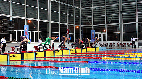 | Xuất phát nội dung 50m chân vịt đôi nữ môn Lặn, VĐV Phạm Như Quỳnh (Nam Định) ở đường bơi số 4 đã xuất sắc phá kỷ lục quốc gia và giành HCV. Ảnh: Thành Trung |