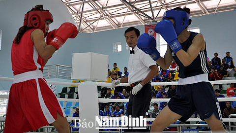 | Thi đấu Boxing ở vòng loại trực tiếp giữa VĐV Hạp Thị Hường (Bắc Ninh) và Bùi Thị Lam (Quảng Ninh). Ảnh: Xuân Thu |