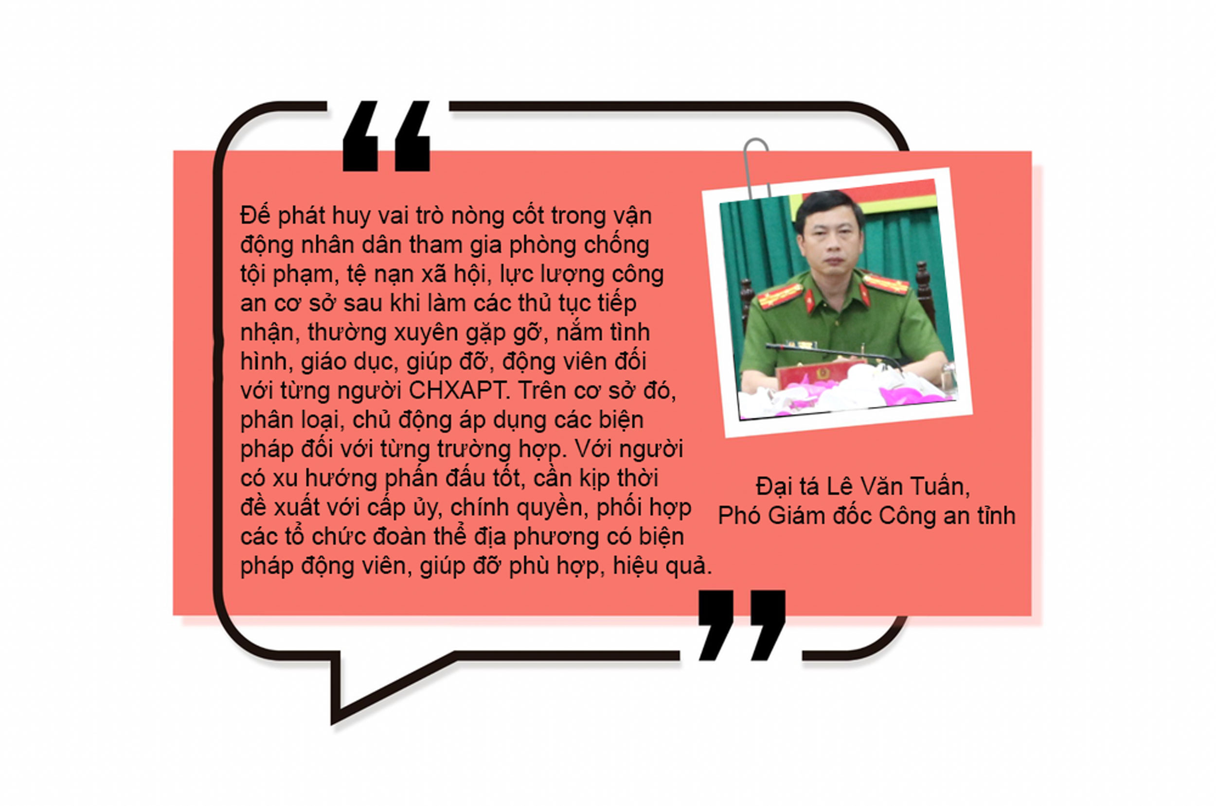 Để thực hiện tốt công tác quản lý, giáo dục, giúp đỡ người CHXAPT tái hòa nhập cộng đồng cần huy động sự chung tay, góp sức của toàn xã hội, trong đó việc phát huy vai trò nòng cốt của lực lượng công an về công tác tham mưu, chủ trì phối hợp tổ chức triển khai là giải pháp rất quan trọng và có ý nghĩa quyết định.