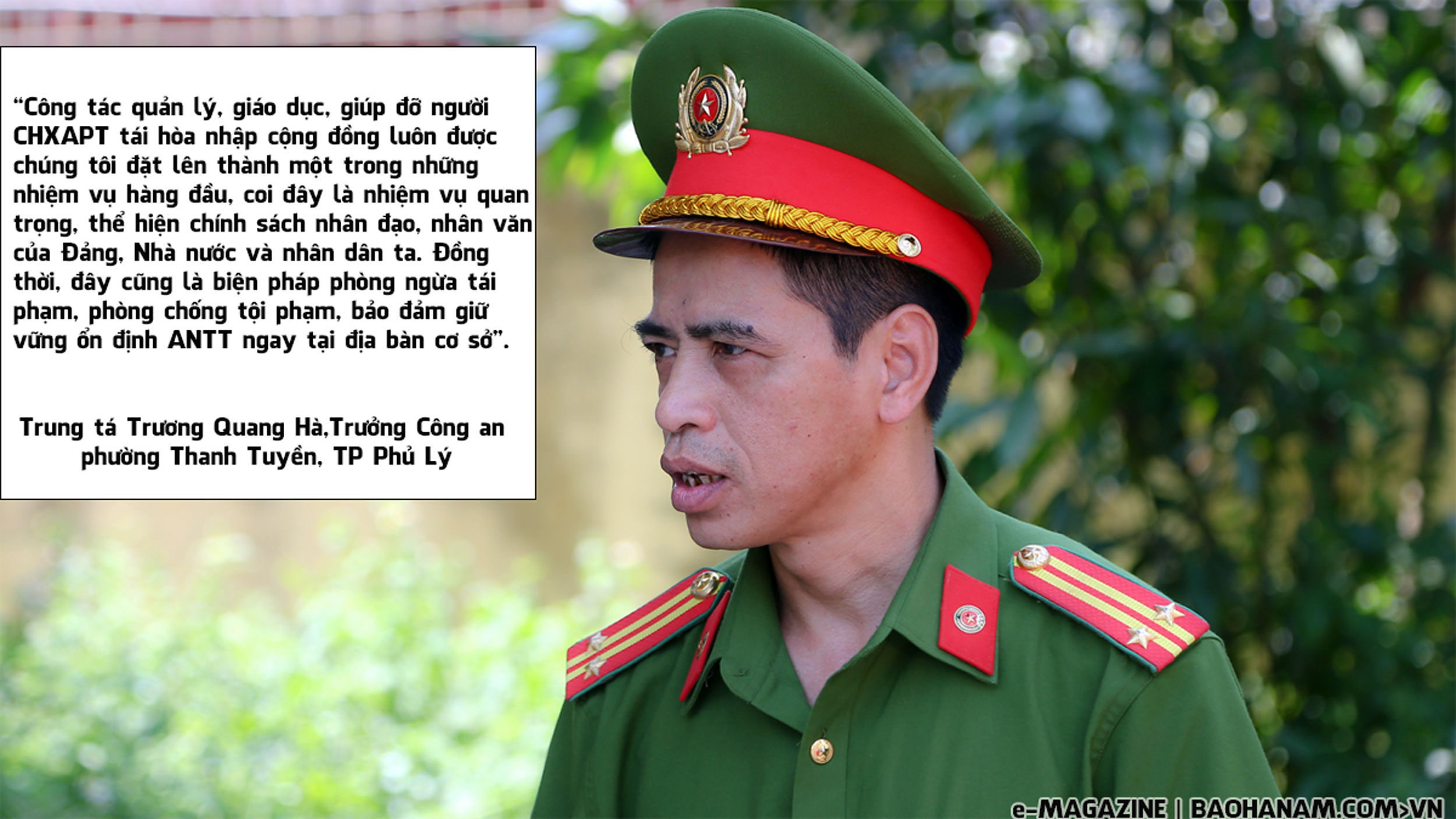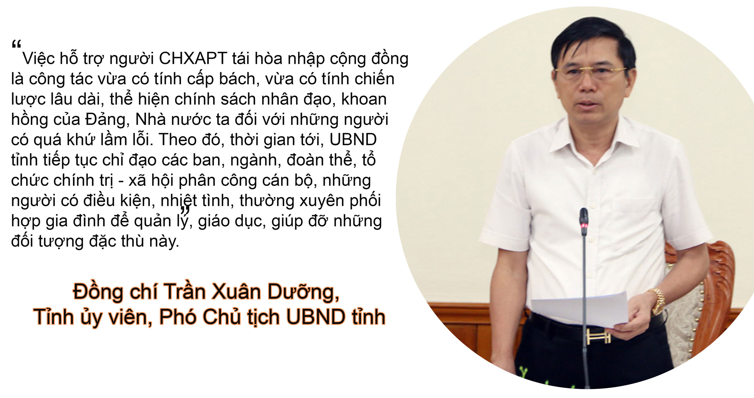 Quản lý, giúp đỡ những người đã chấp hành xong án phạt tù (CHXAPT) trở về tái hòa nhập cộng đồng là một việc làm thể hiện đậm nét tính nhân văn. Từ nhận thức đó, những năm qua, việc tiếp nhận, quản lý, giáo dục, giúp đỡ người CHXAPT khi trở về địa phương luôn được cấp ủy, chính quyền, ban, ngành, đoàn thể quan tâm thực hiện và đạt nhiều kết quả tích cực, giúp những người lầm lỗi xóa bỏ mặc cảm, hòa nhập cộng đồng, xây dựng cuộc sống mới. Đến nay, nhiều người lầm lỗi sau khi CHXAPT trở về địa phương đã ổn định cuộc sống, vươn lên trở thành những công dân có ích cho xã hội.