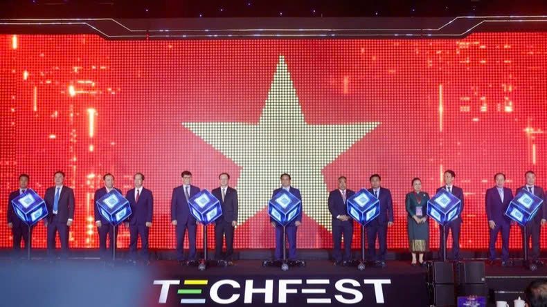 Tại sự kiện, Thủ tướng Phạm Minh Chính cùng các đồng chí lãnh đạo thực hiện nghi thức khởi động TECHFEST Việt Nam 2024.