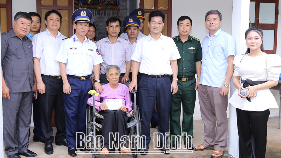 | Đồng chí Trần Anh Dũng, Ủy viên Ban TVTU, Phó Chủ tịch Thường trực UBND tỉnh và các đồng chí lãnh đạo Bộ Tư lệnh Vùng Cảnh sát biển 1, tỉnh, huyện Hải Hậu tặng quà Mẹ Việt Nam Anh hùng Bùi Thị Chắt, 102 tuổi xóm 3 xã Hải An (Hải Hậu). |