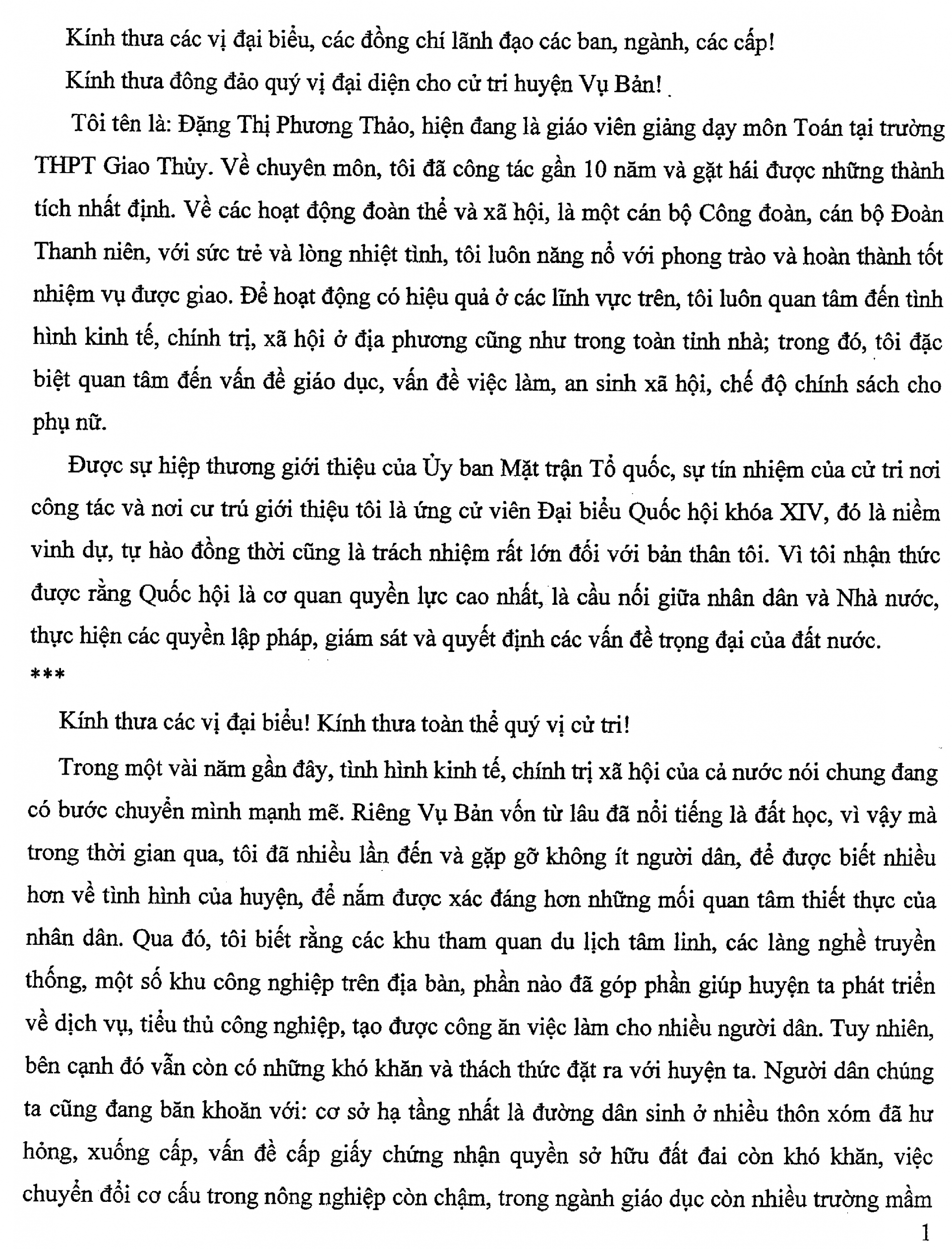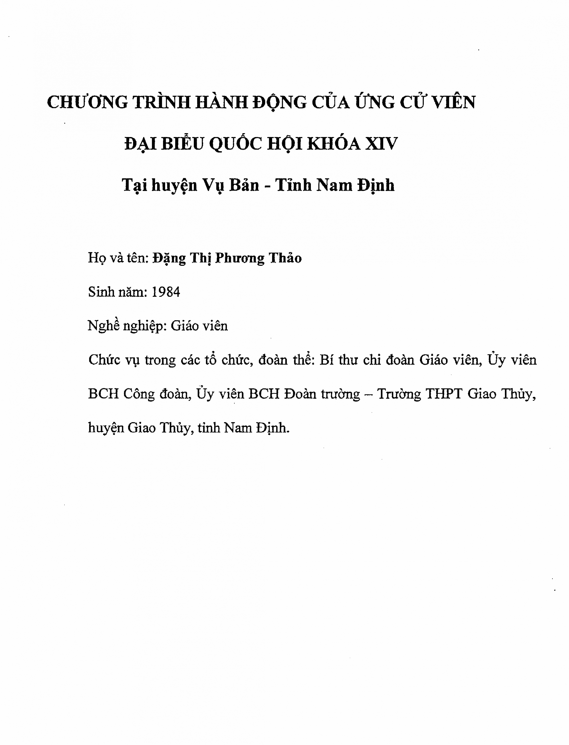 Chương trình hành động của bà Đặng Thị Phương Thảo, ứng cử viên Đại biểu Quốc hội khoá XIV