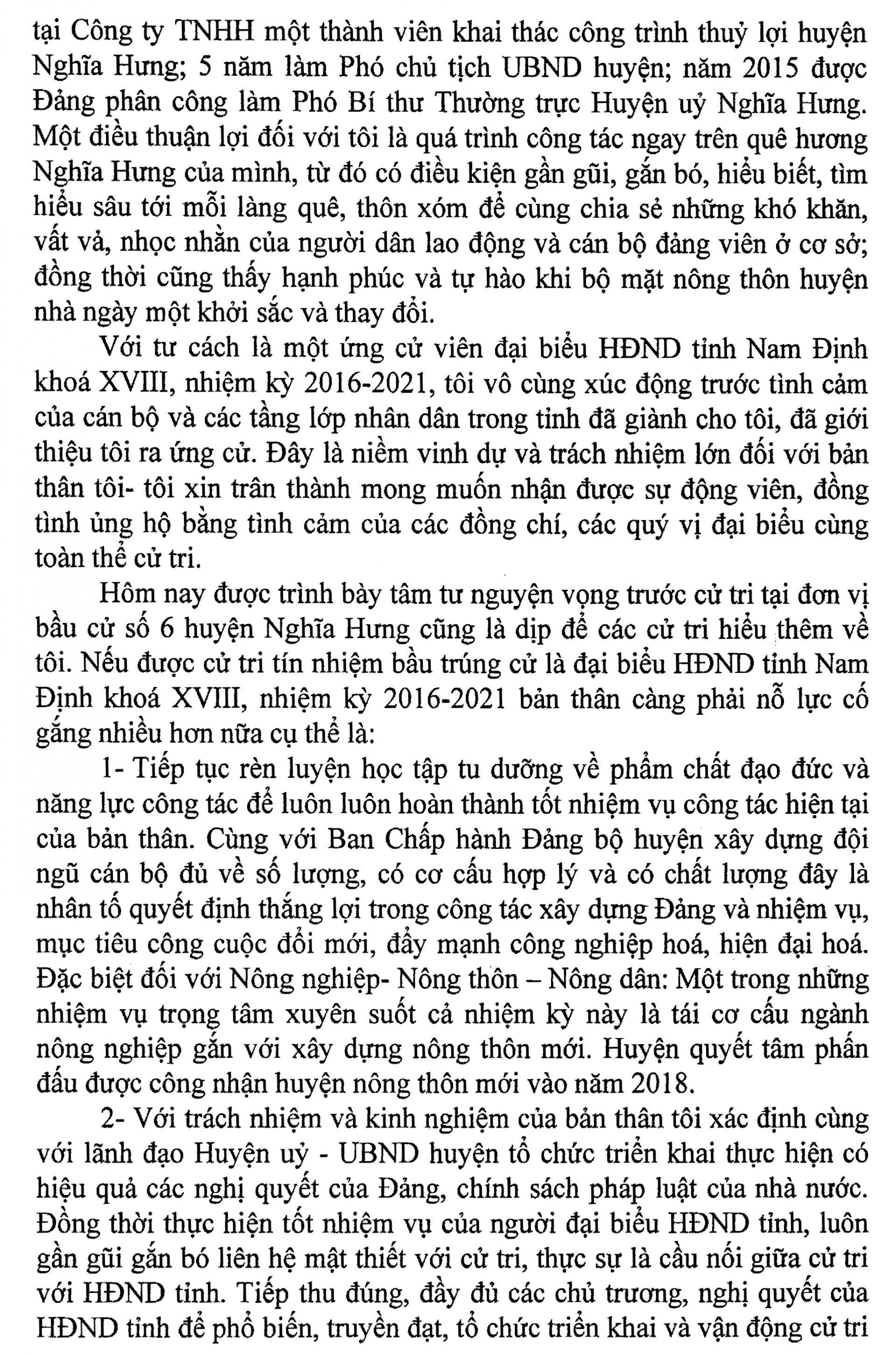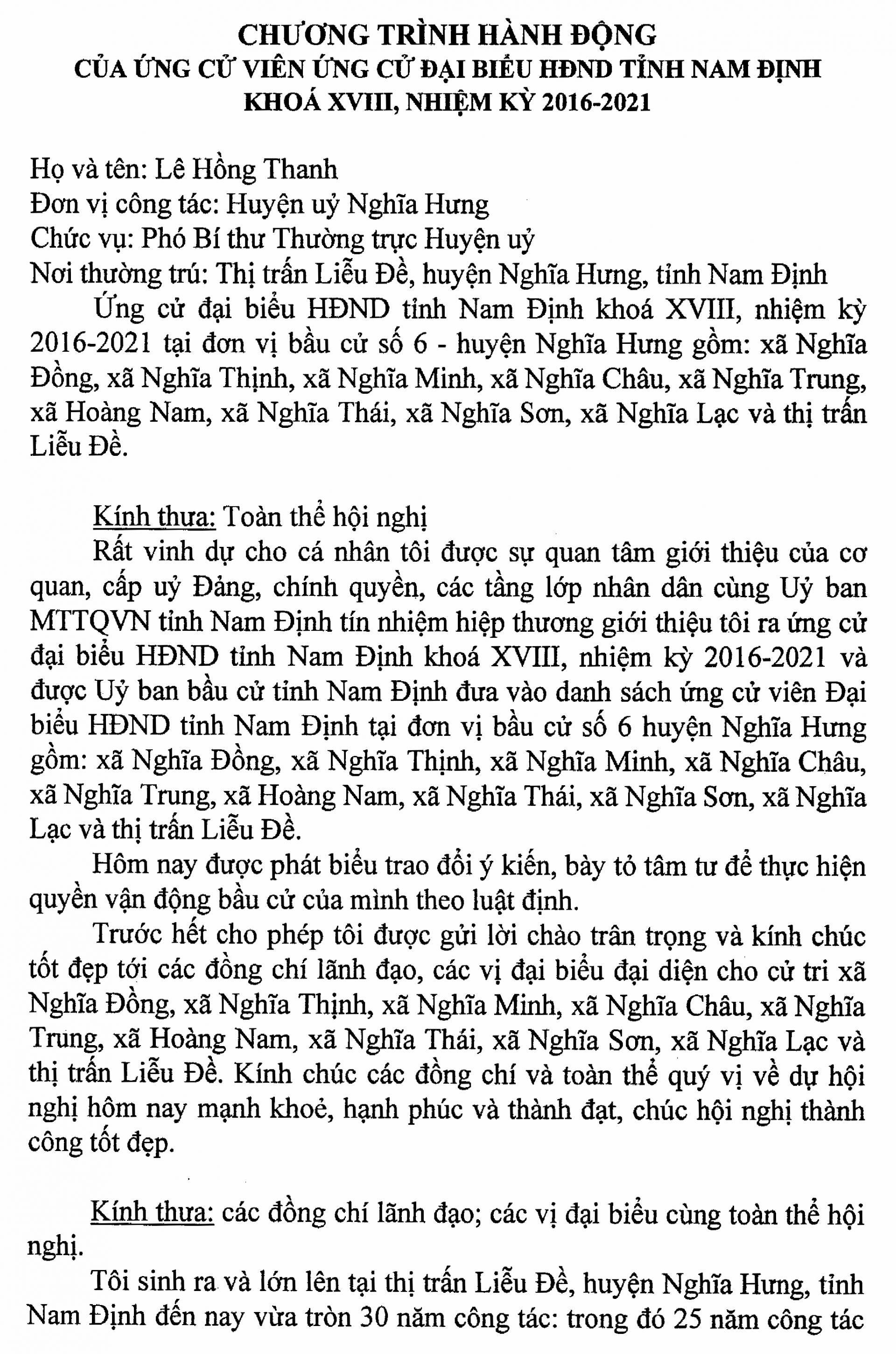 Chương trình hành động của ông Lê Hồng Thanh, ứng cử viên Đại biểu HĐND tỉnh Nam Định khoá XVIII