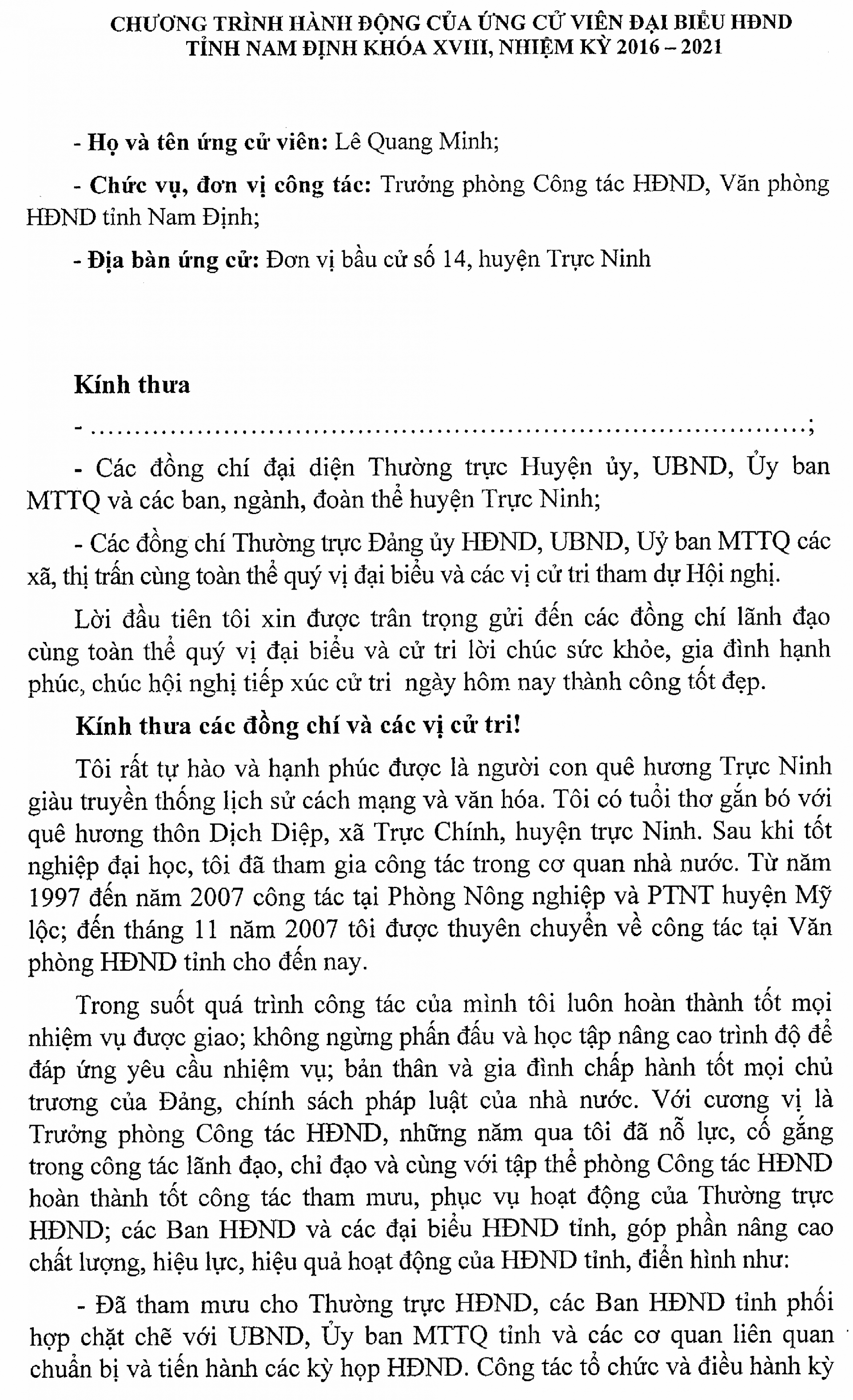 Chương trình hành động của ông Lê Quang Minh, ứng cử viên Đại biểu HĐND tỉnh Nam Định khoá XVIII