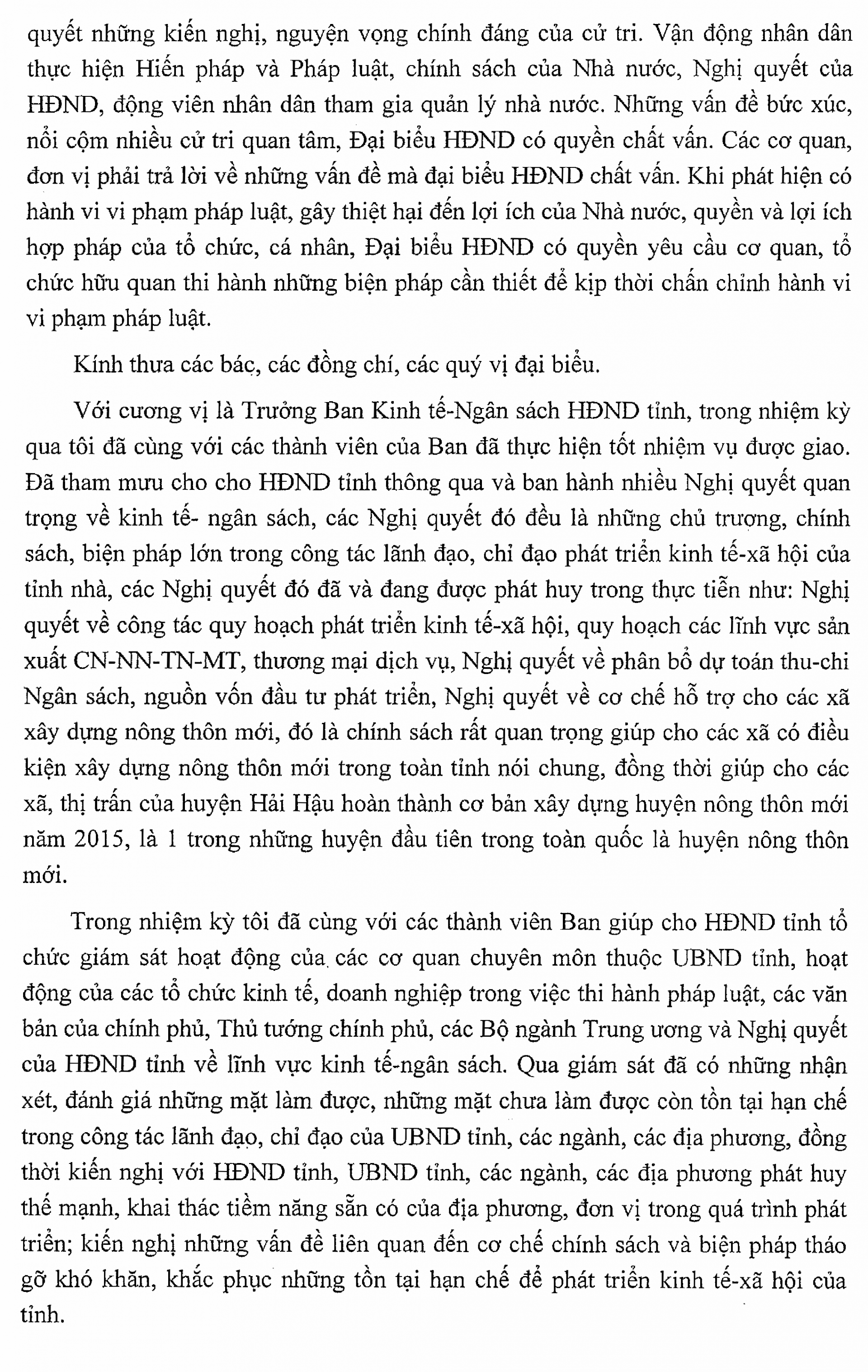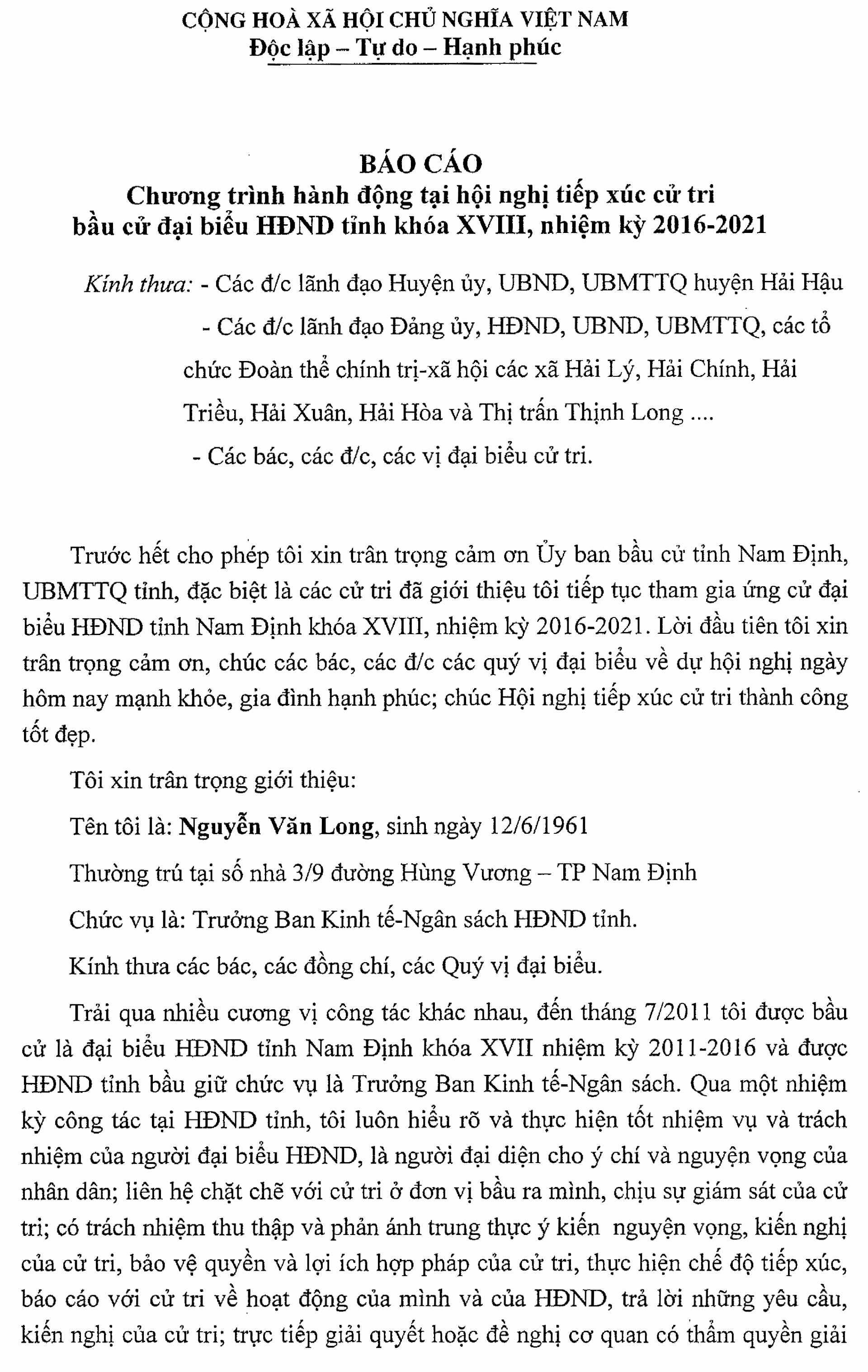 Chương trình hành động của ông Nguyễn Văn Long, ứng cử viên Đại biểu HĐND tỉnh Nam Định khoá XVIII