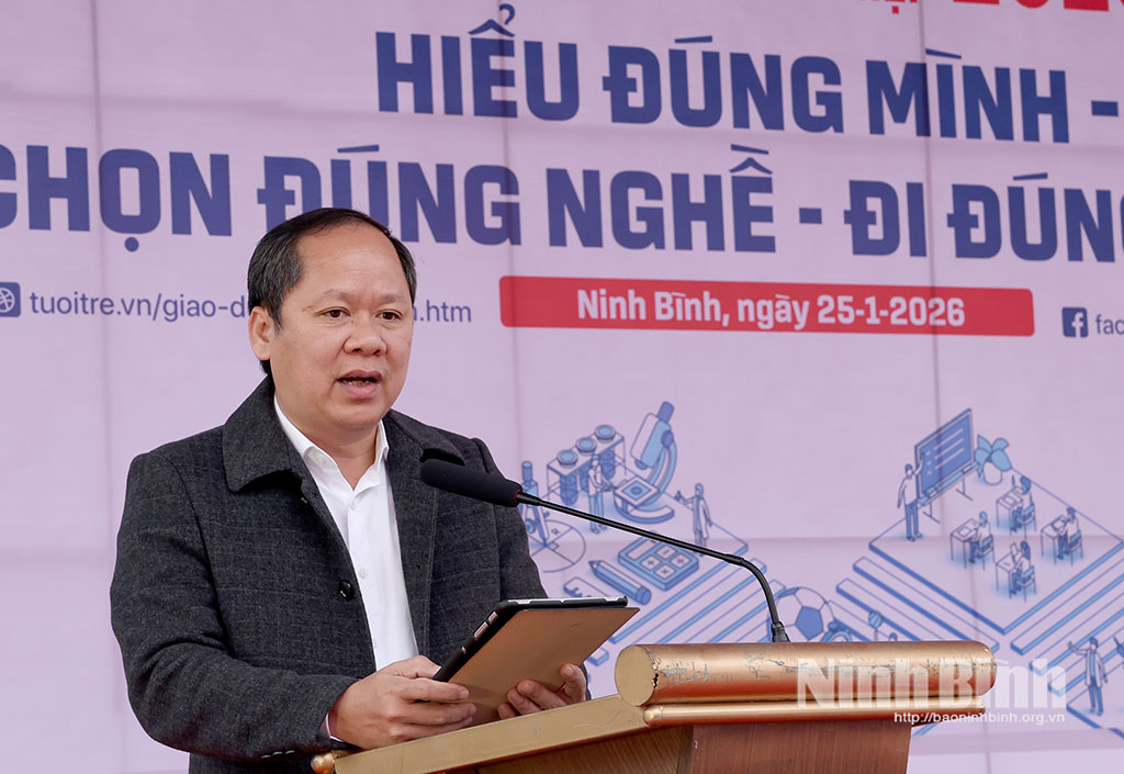Phát biểu tại Chương trình, lãnh đạo Sở Giáo dục và Đào tạo Ninh Bình nhấn mạnh: Chương trình Tư vấn tuyển sinh - hướng nghiệp năm 2026 là hoạt động có ý nghĩa thiết thực, góp phần hỗ trợ học sinh THPT trong việc tiếp cận thông tin tuyển sinh, định hướng ngành nghề và lựa chọn con đường học tập, lập nghiệp phù hợp sau khi tốt nghiệp phổ thông.